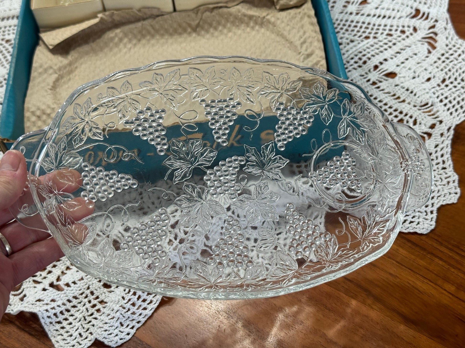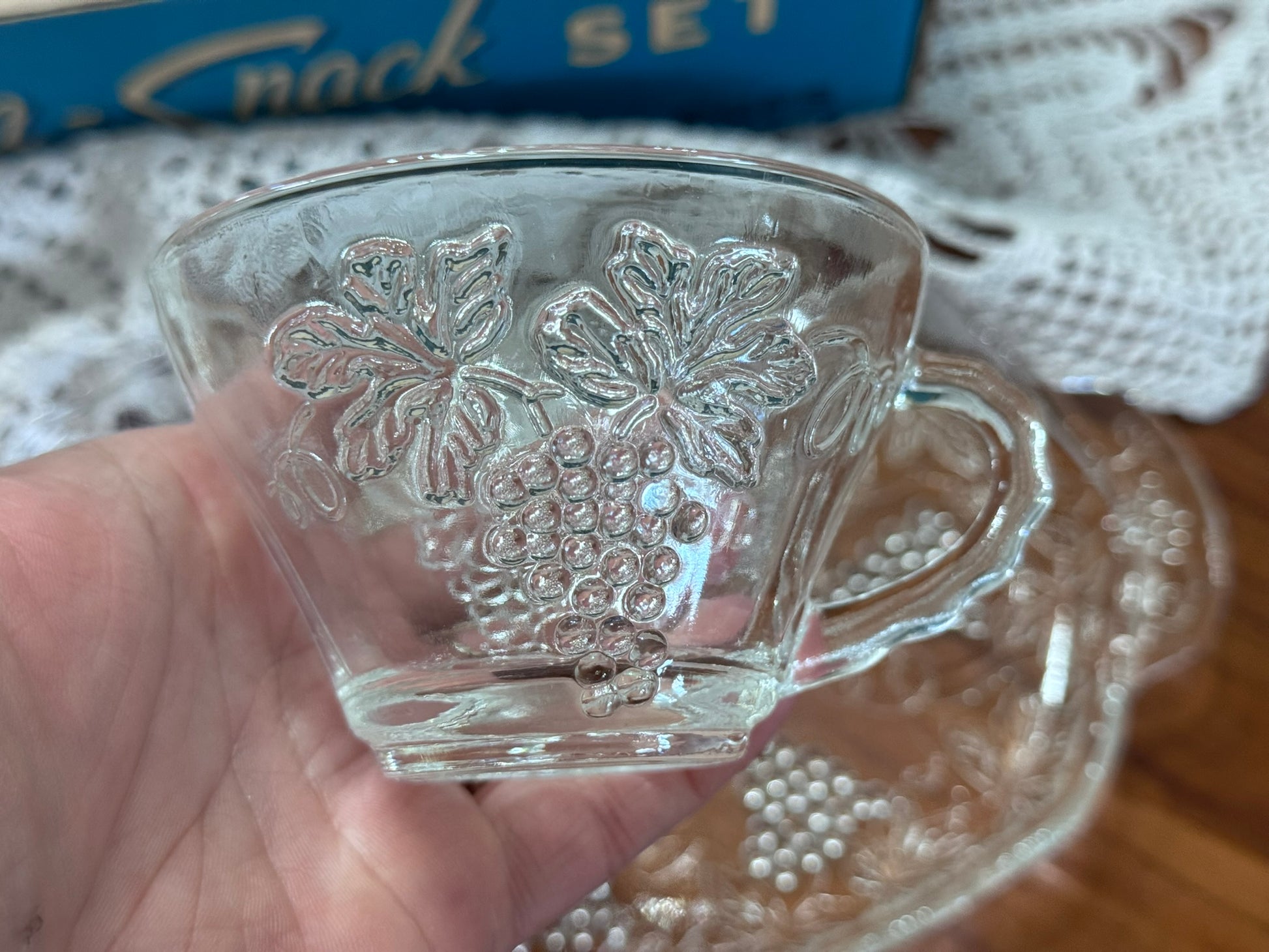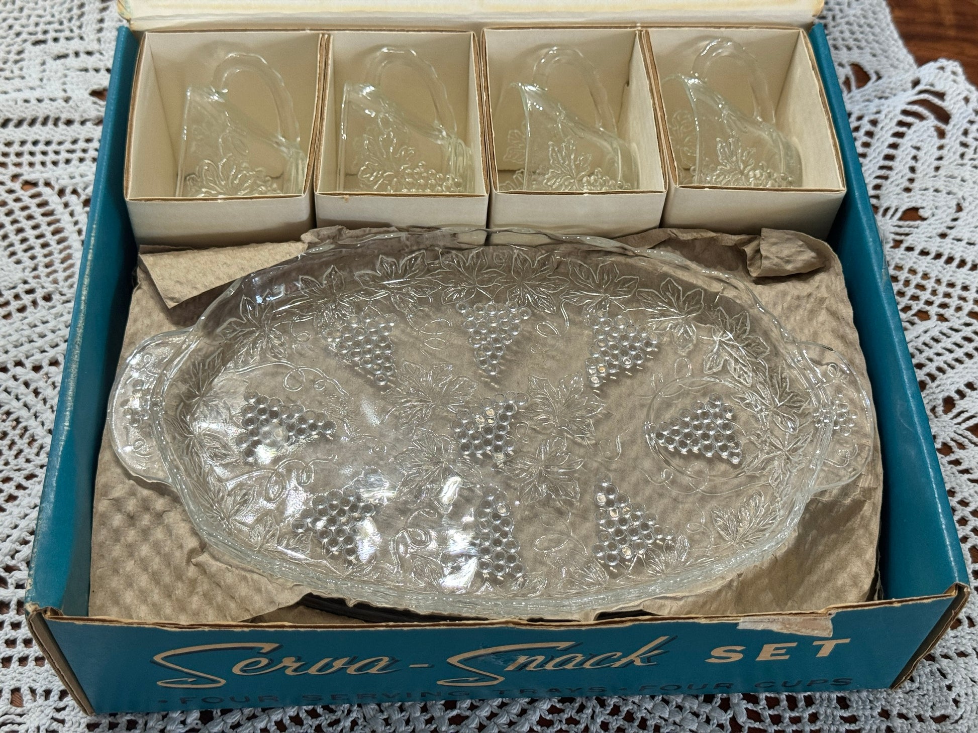 This is a lovely boxed and marked "Another Fine Anchor Hocking Product, 8 Piece Serva-Snack Set." A cute vintage addition to your collection and or serving ware.