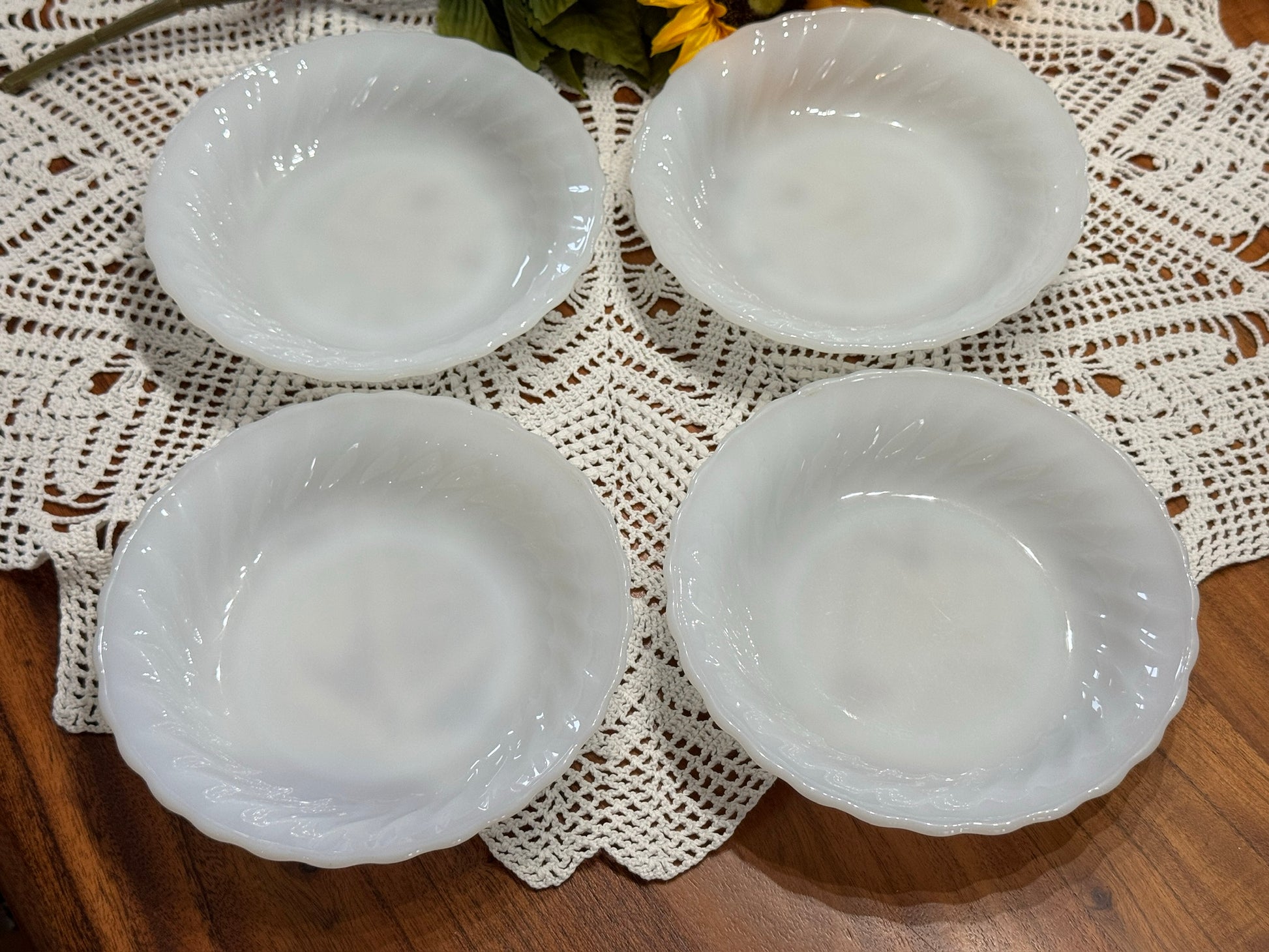 This is a lovely set of 4 vintage marked "Anchor Hocking, Fire-King, Oven Proof, Made In U.S.A." Milk Glass Bowls in swirl pattern. 2 "Anchor Hocking, Oven Proof, Made In U.S.A. 2368" different marking but same pattern.