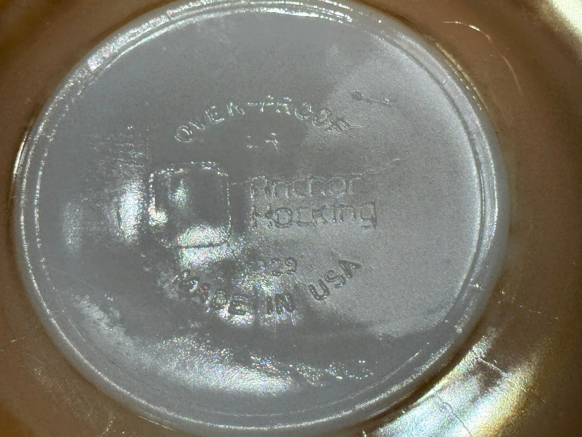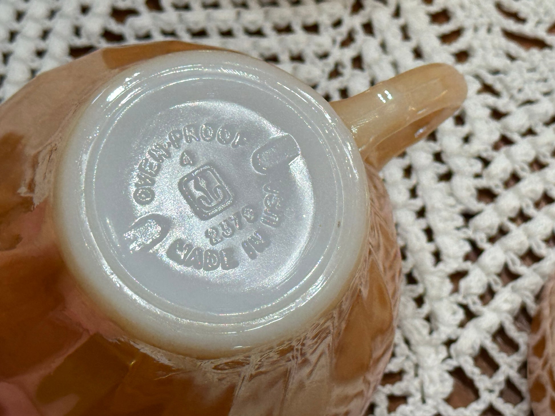 This is a lovely set of 2 vintage marked "Anchor Hocking, Oven-Proof, Made In USA 2379" Peach Luster Demitasse Cup & Saucers in the swirl or shell design. A beautiful pair to add to your collection and or serving ware.