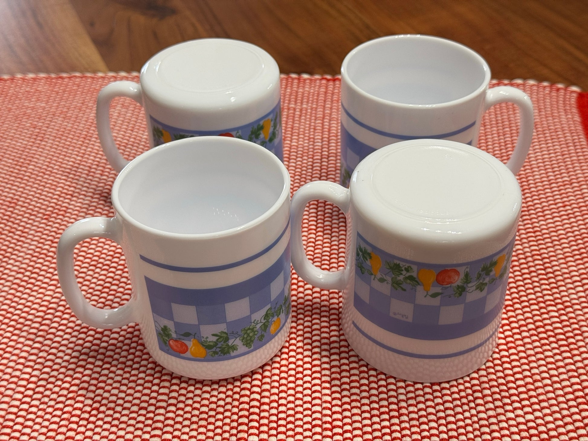 This is a lovely vintage set of 4 marked "Arcopal France, Pulluy" blue chekered with fruits design Mugs. A cute quality addition to add to your collection and or kitchen/serving ware.