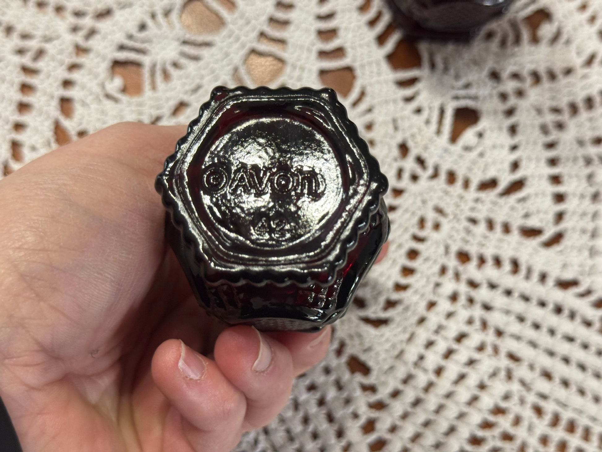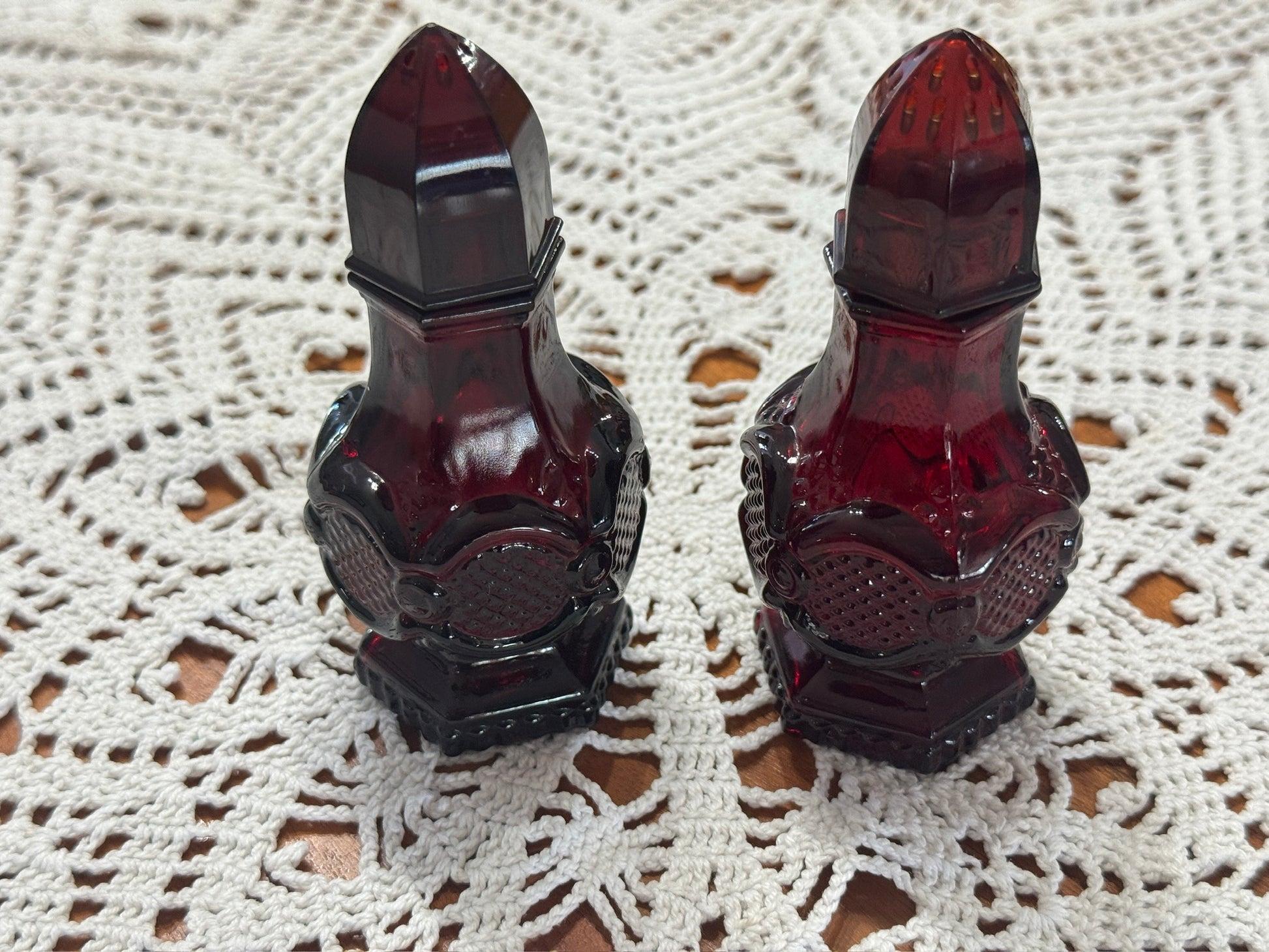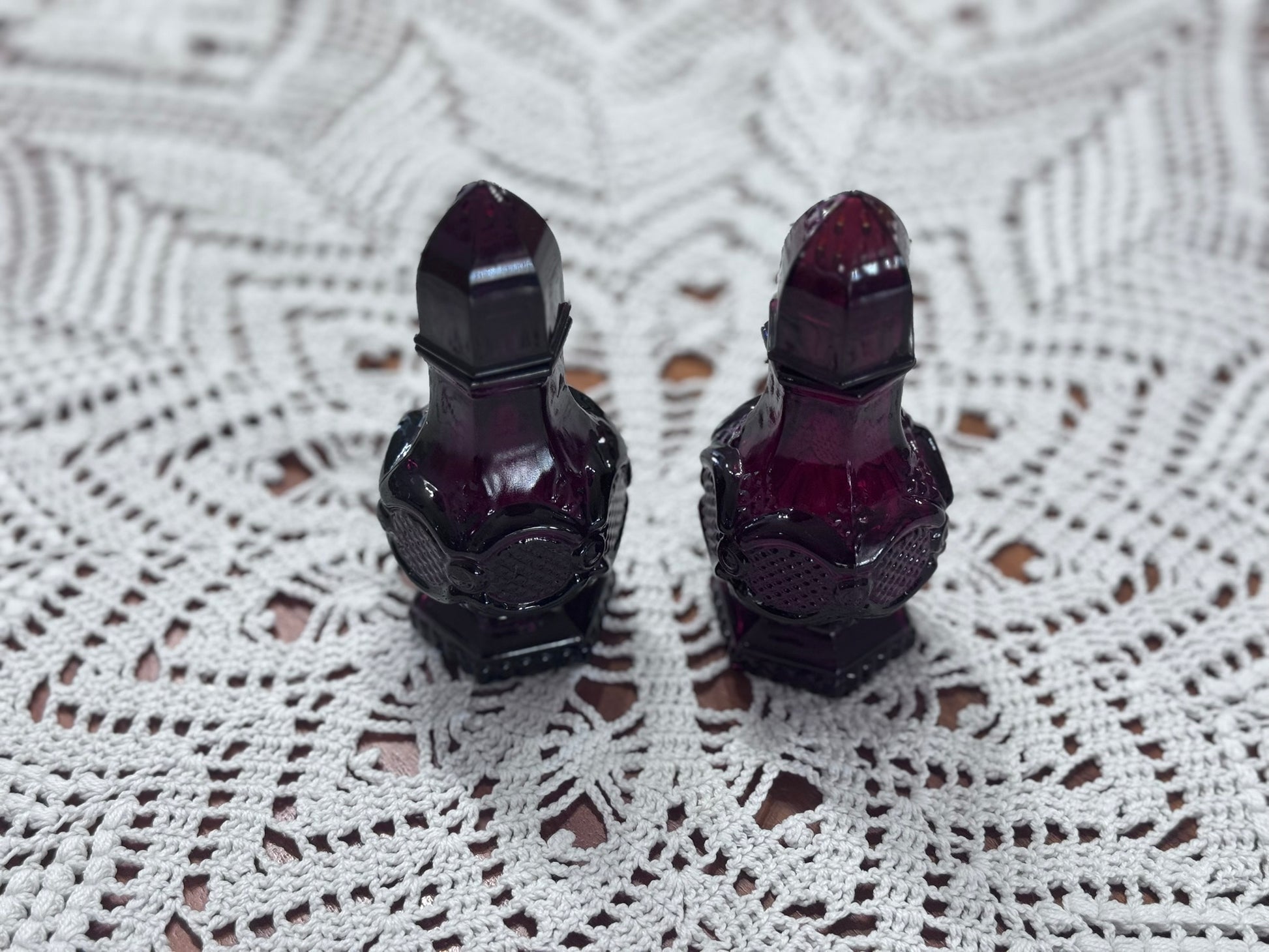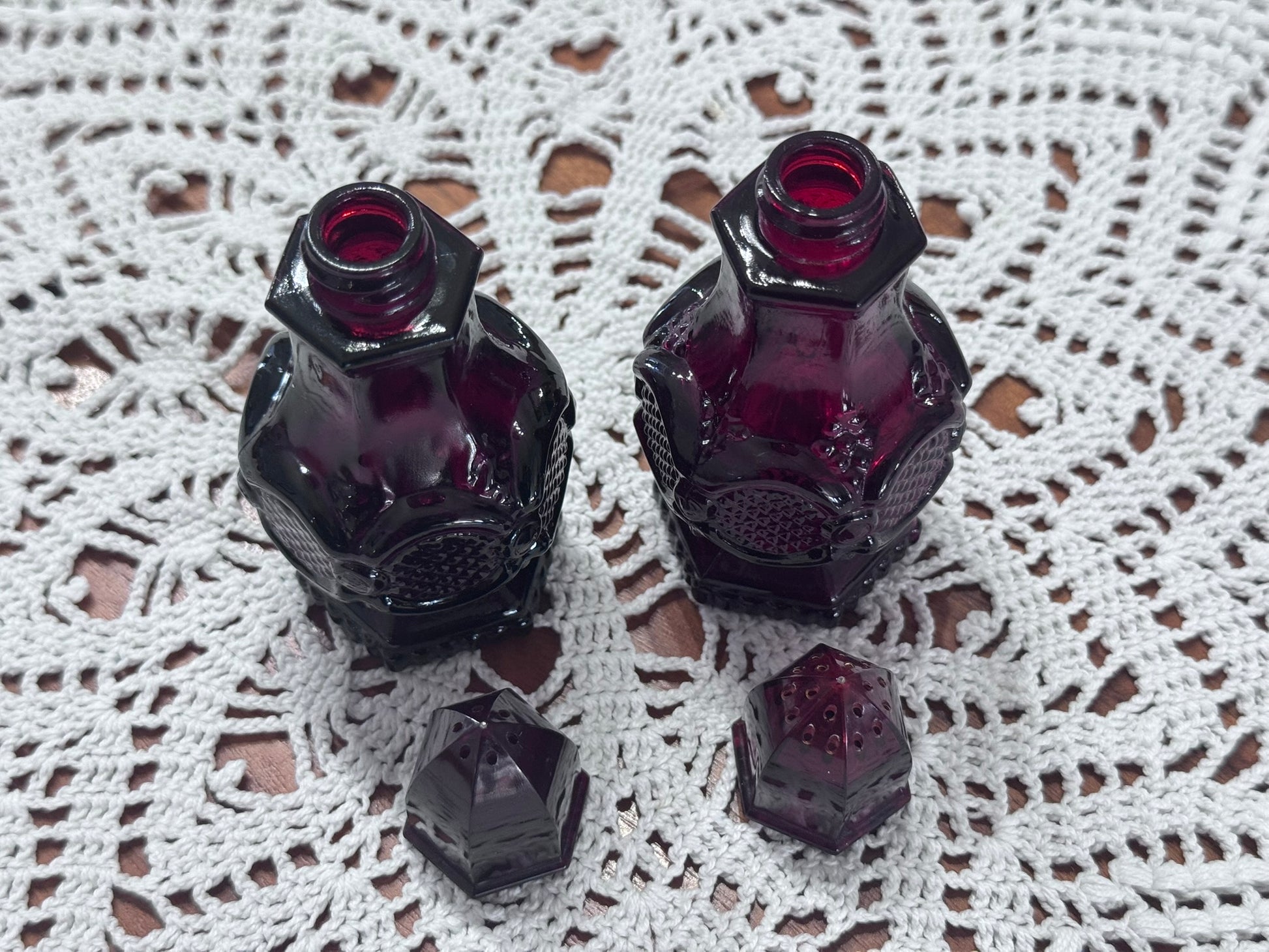 This is a lovely set of marked "AVON" Salt & Pepper Shakers from the 1876 Cape Cod Collection. These beautiful shakers have a ruby red glass base and ruby red plastic tops adding warmth and style to your space.