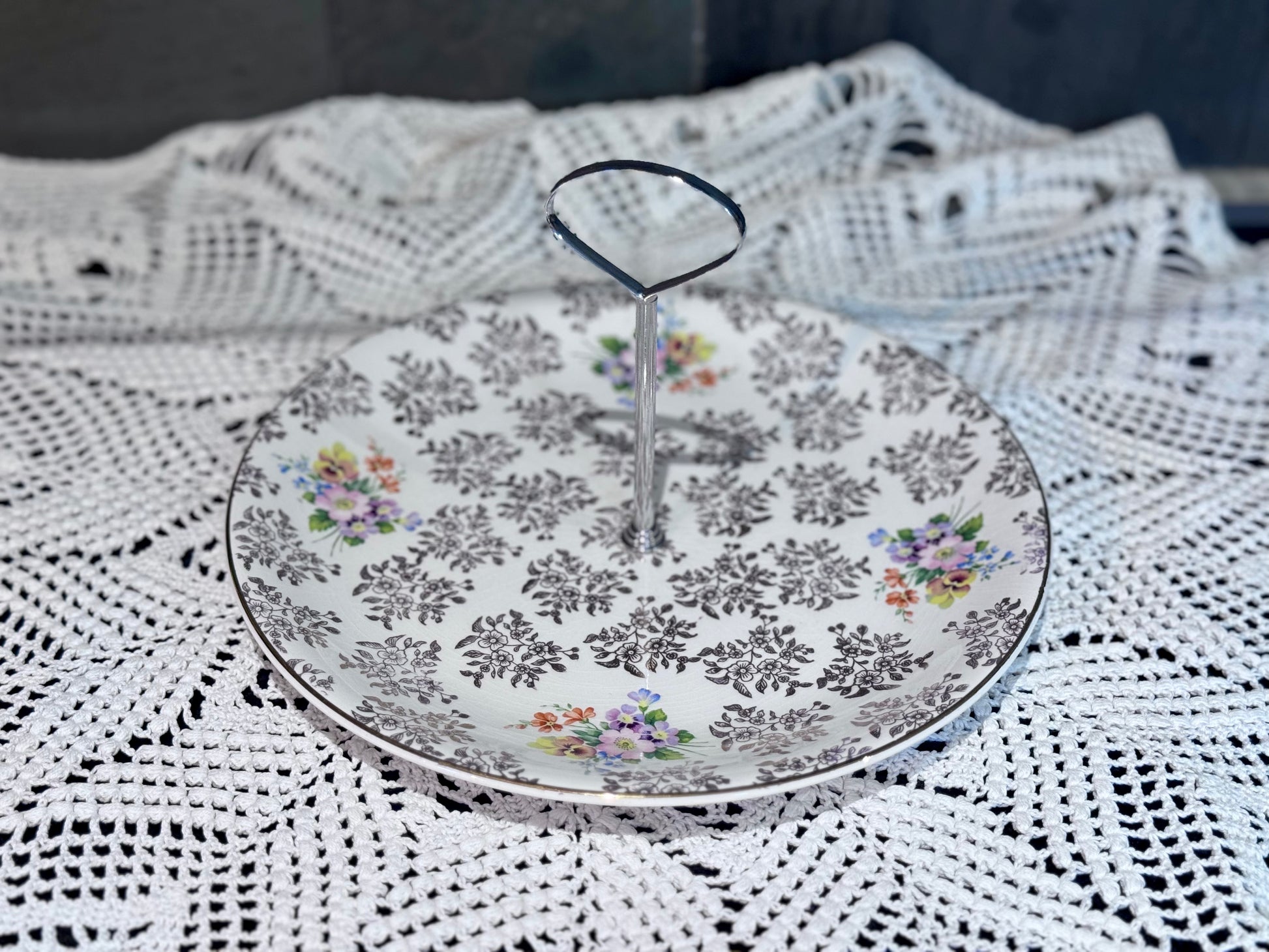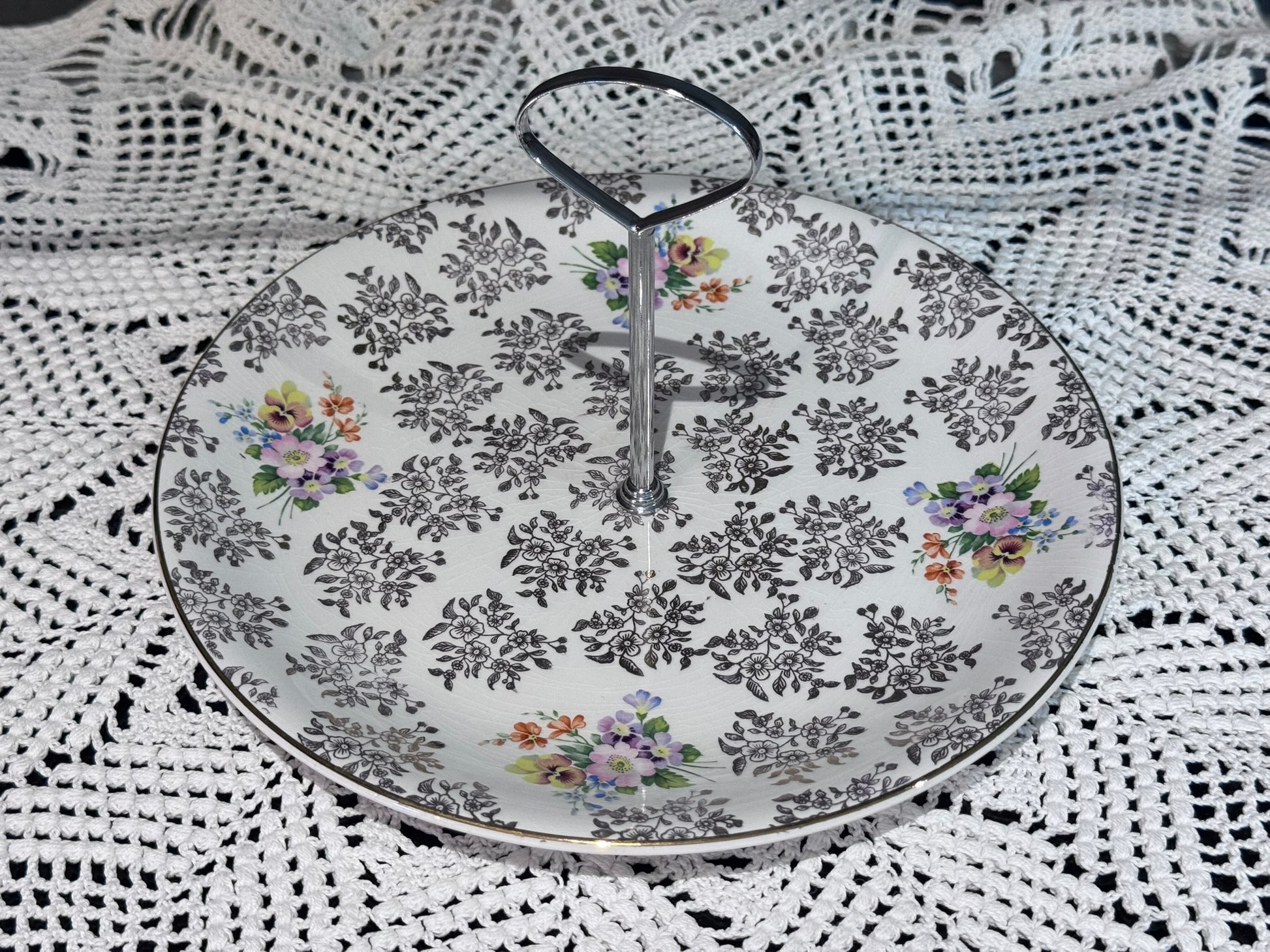 This is a lovely vintage marked "Barratt's Ironstone England, Delphatic White Tableware, REGD. NO. 8755897" Pastry Plate. This plate features and gilded chintz floral design with metal handle. A beautiful piece to add some vintage charm to your table/serving ware.
