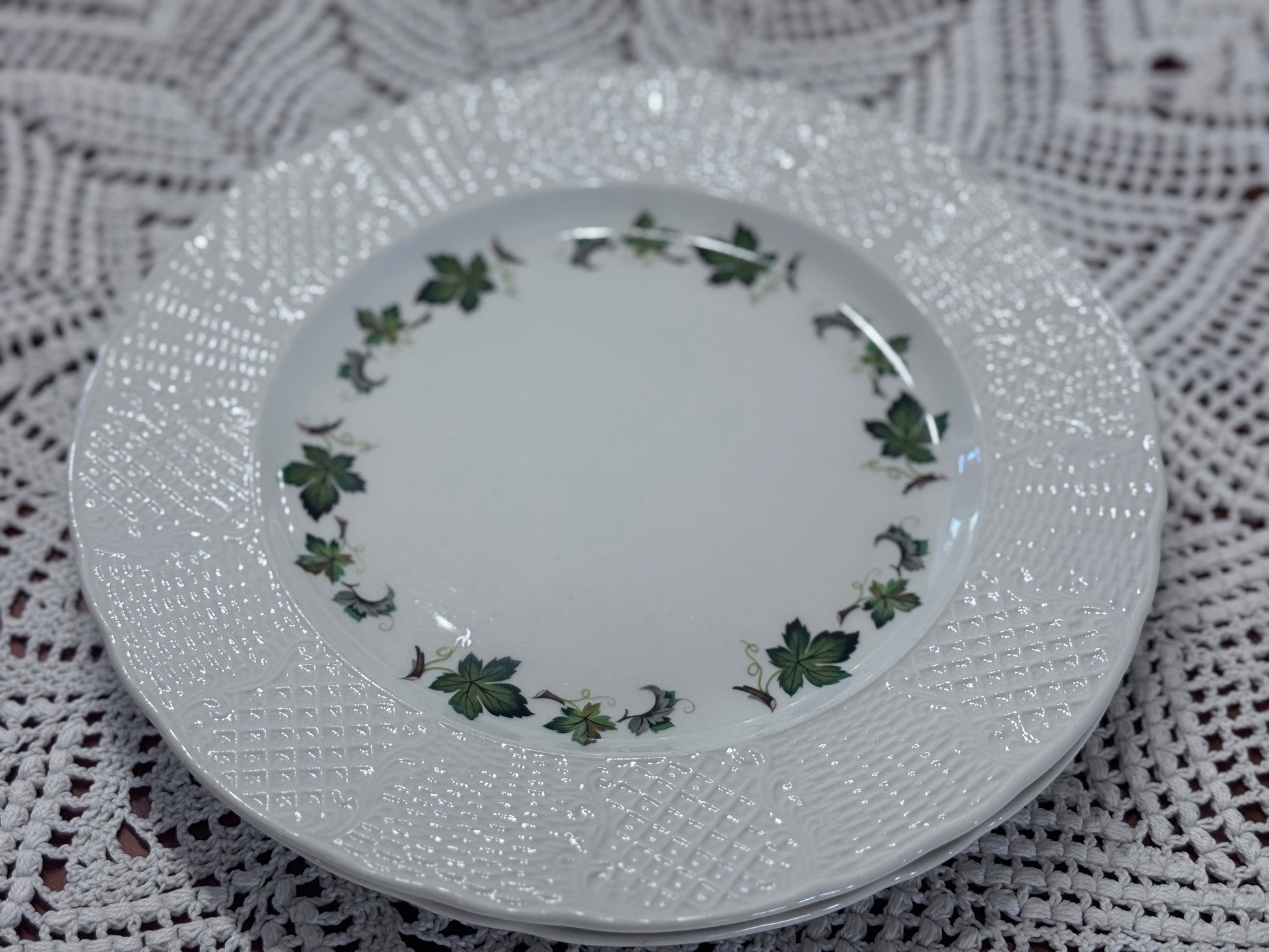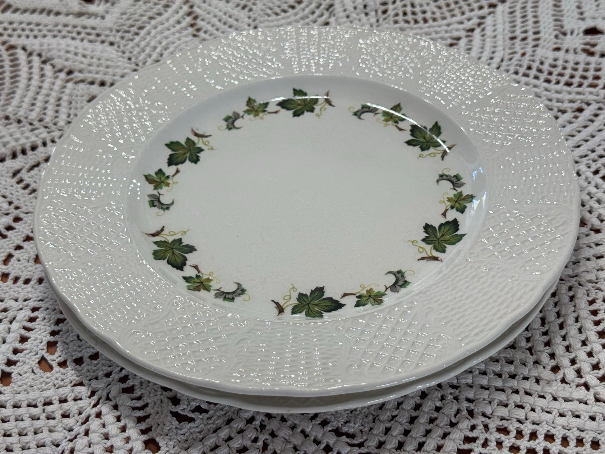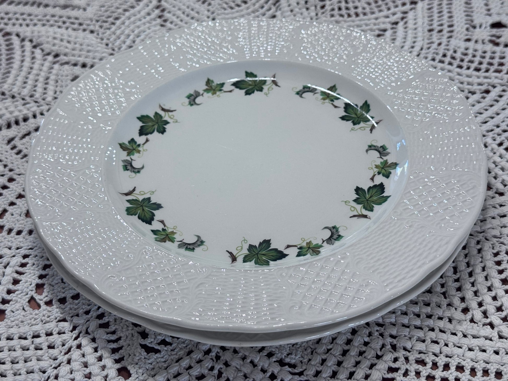 This is a lovely set of 2 marked "Burleigh Ironstone, Staffordshire England, 8-78 Concorde" Dinner Plates. These plates feature leaf/vines on a white ironstone. Simple, yet charming set to add to your collection and or serving ware.