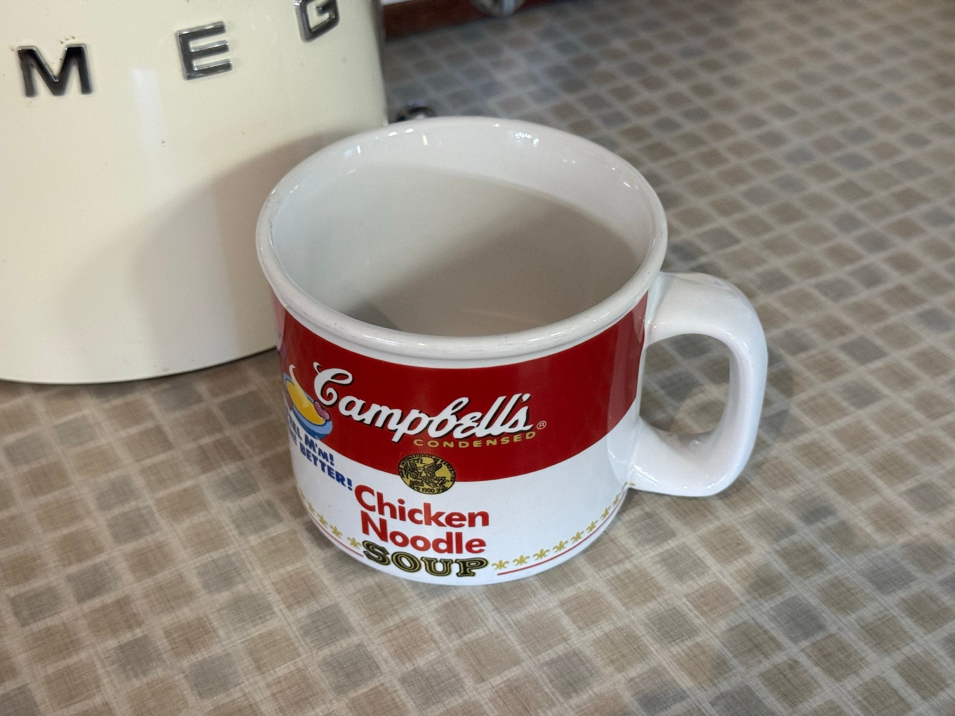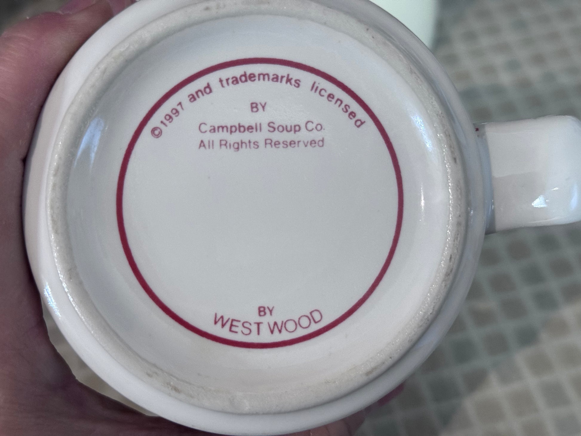 This is a lovely marked "1997 and trademark licensed By Campbell Soup Co., All Rights Reserved By Westwood" Chicken Noodle Soup Mug. Perfect for collecting and or gifting the soup lovers in your life.
