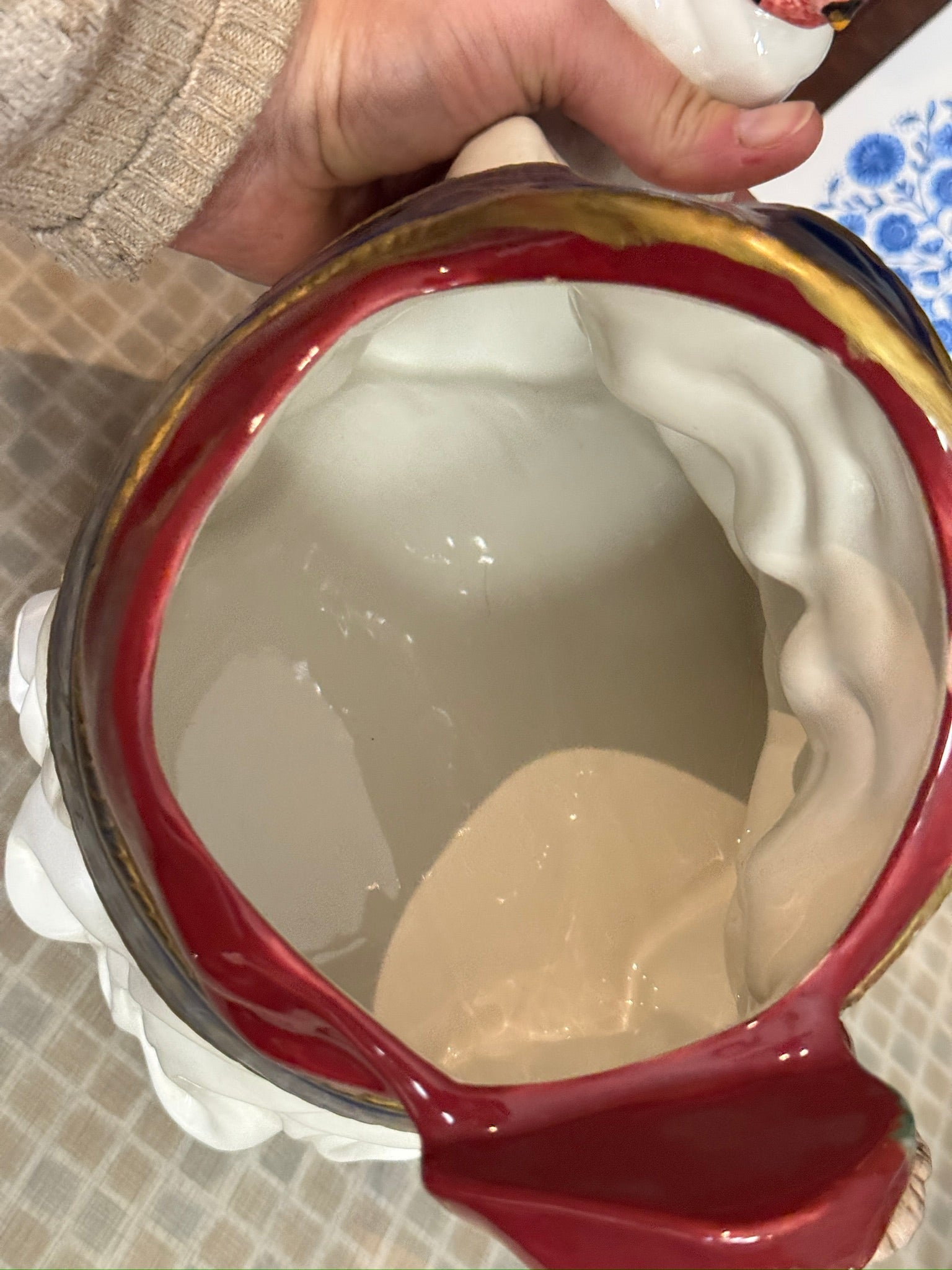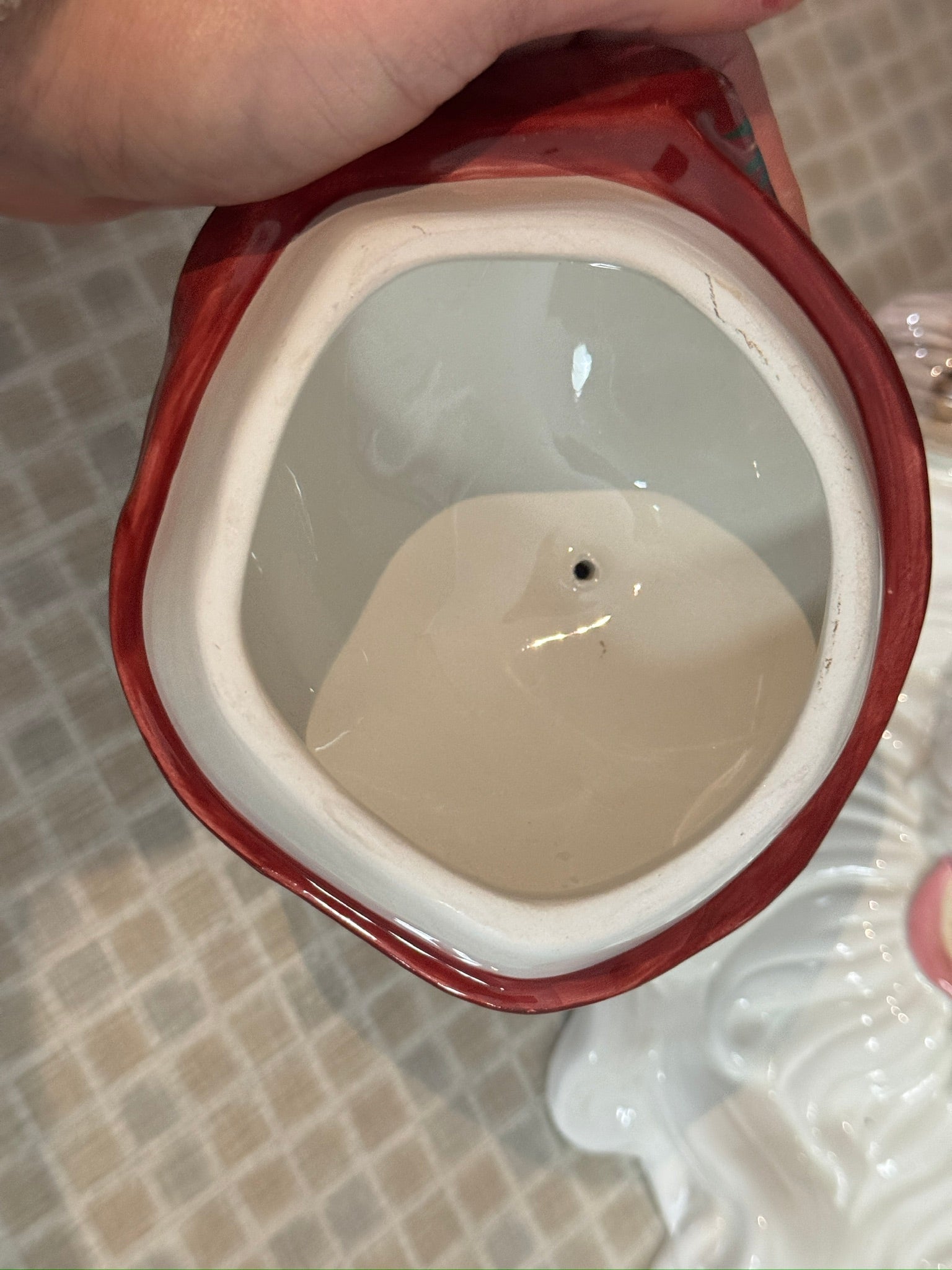 This is a lovely unmarked Winking Santa Head Cookie Jar with cardinal on his beard. A stunning piece offering vintage nostalgia and charm for the holiday season.
