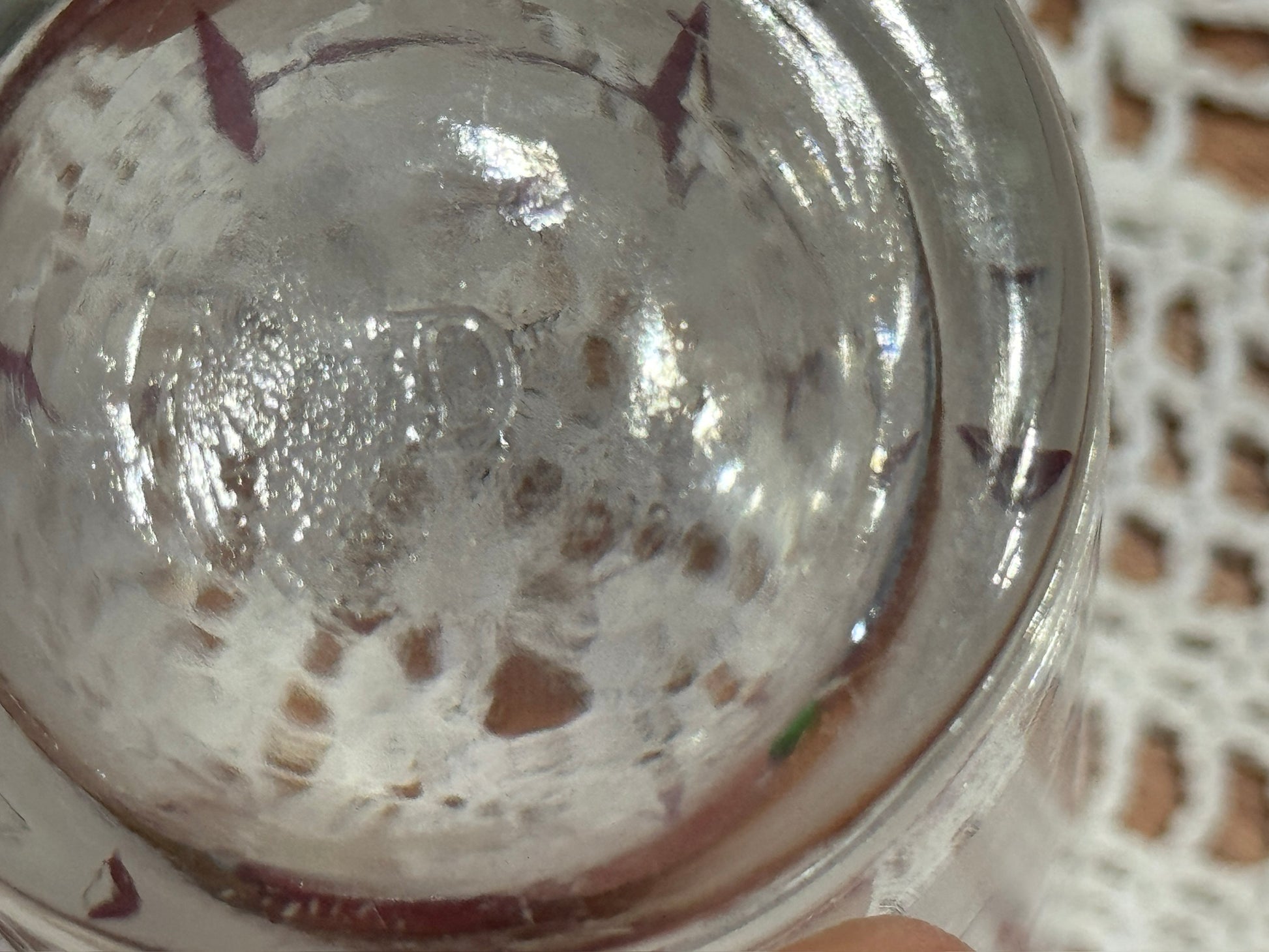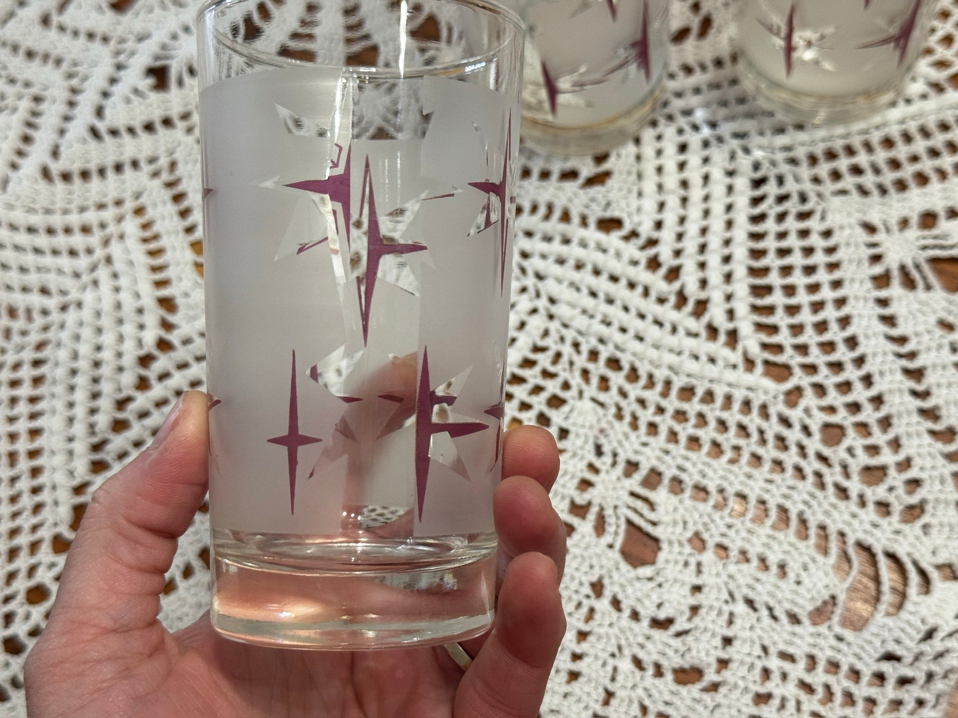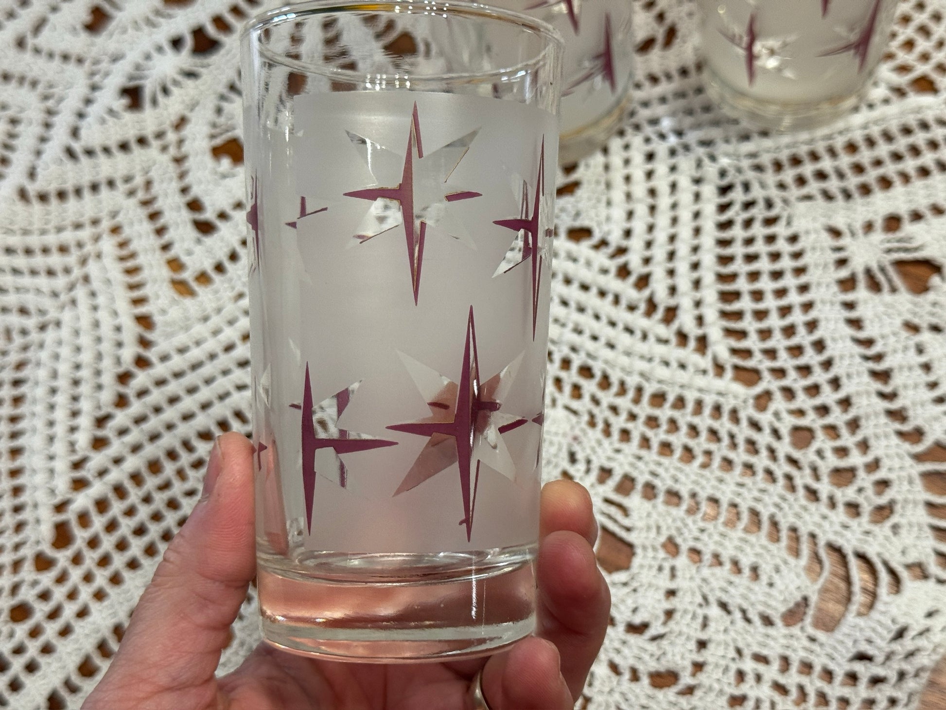 This is a lovely set of marked "D" Dominion Drinking Glasses featuring a pink/purple and silver eight point starburst pattern. Perfect for adding some retro style to your drink/bar ware.