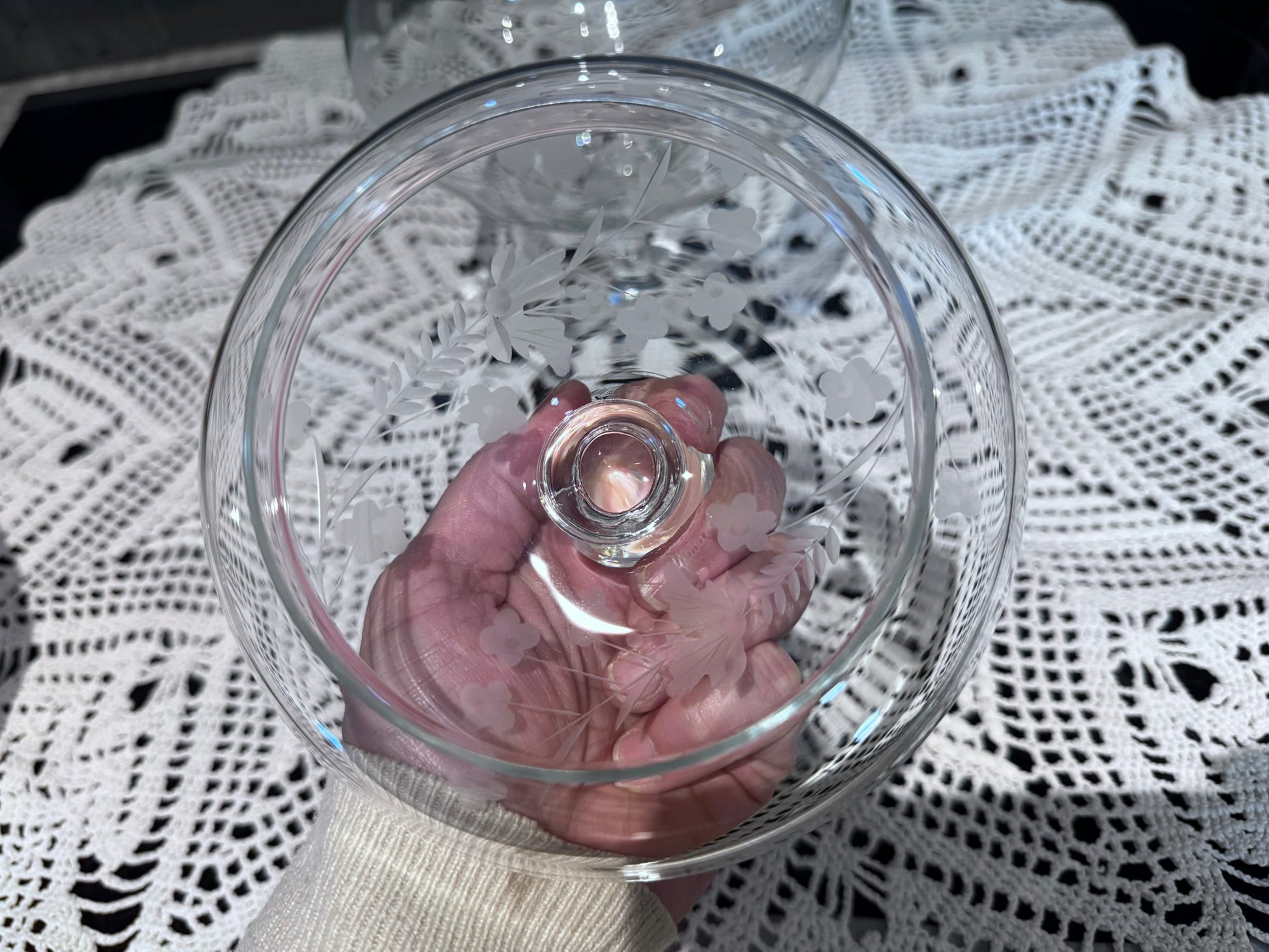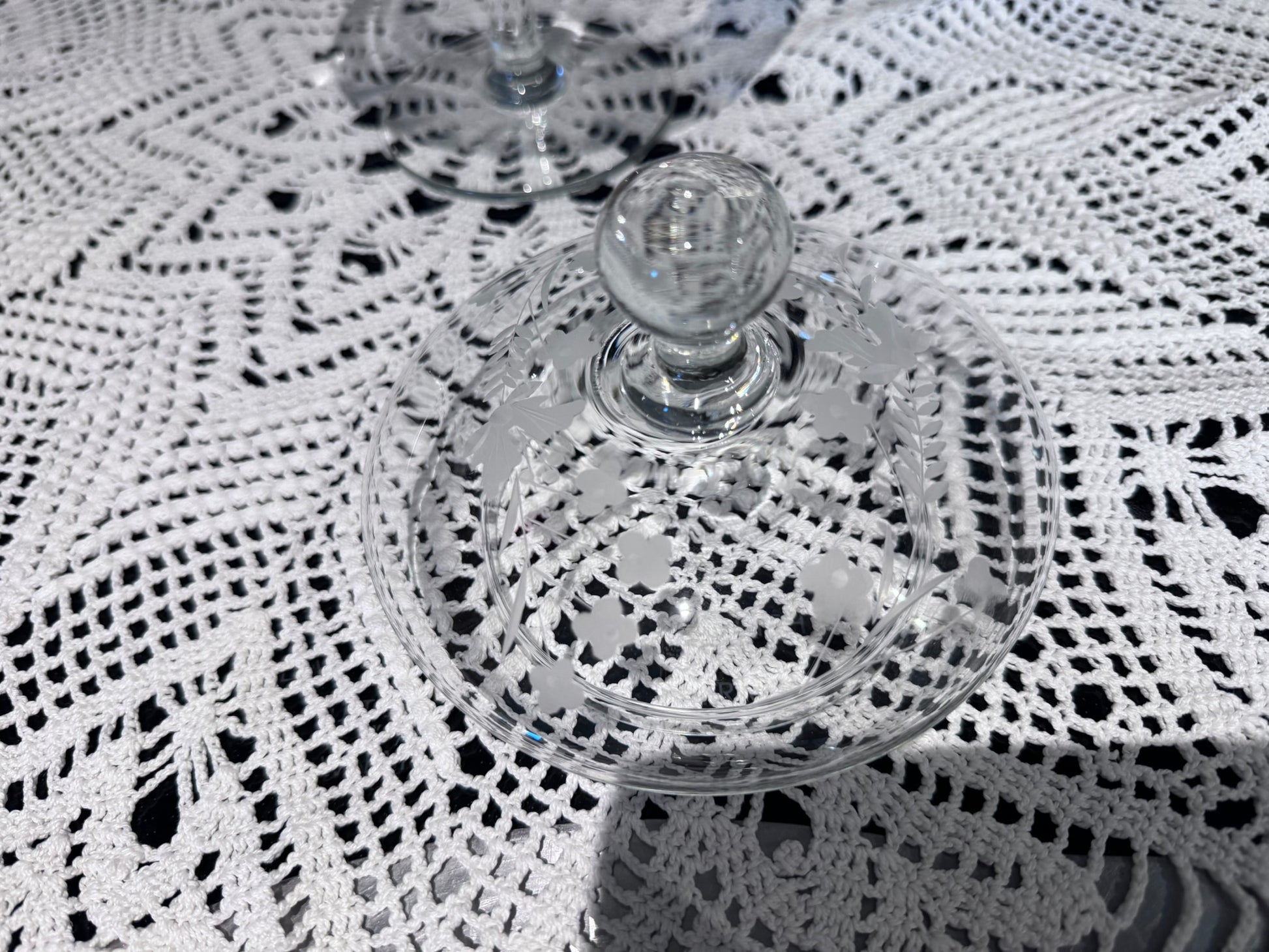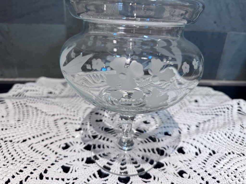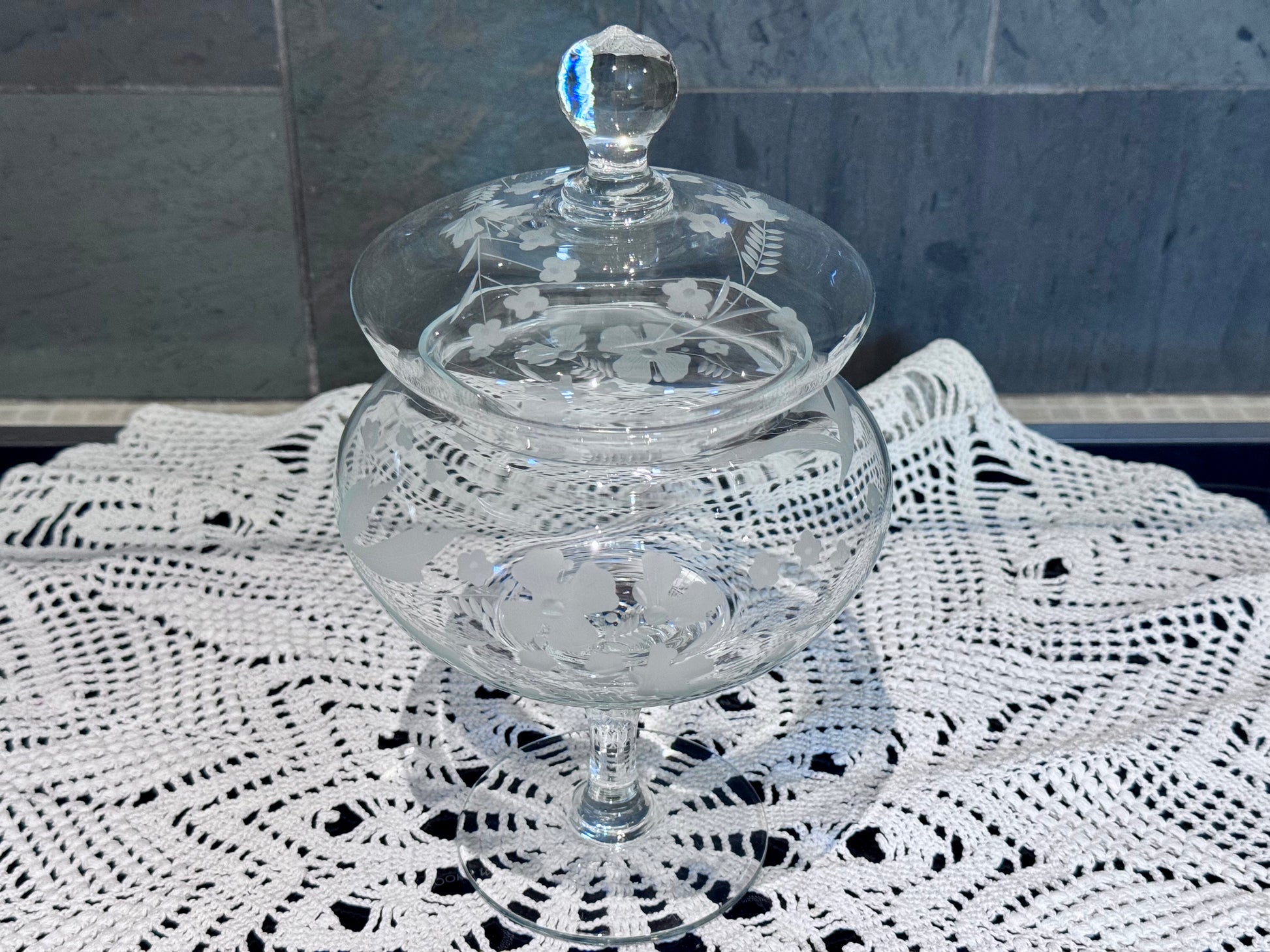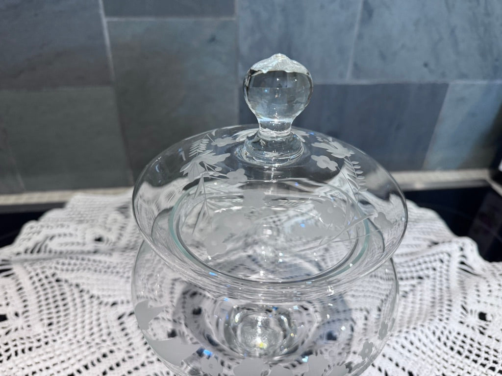 Etched Floral 'Caroline' Lidded Crystal Glass Pedestal Candy Dish