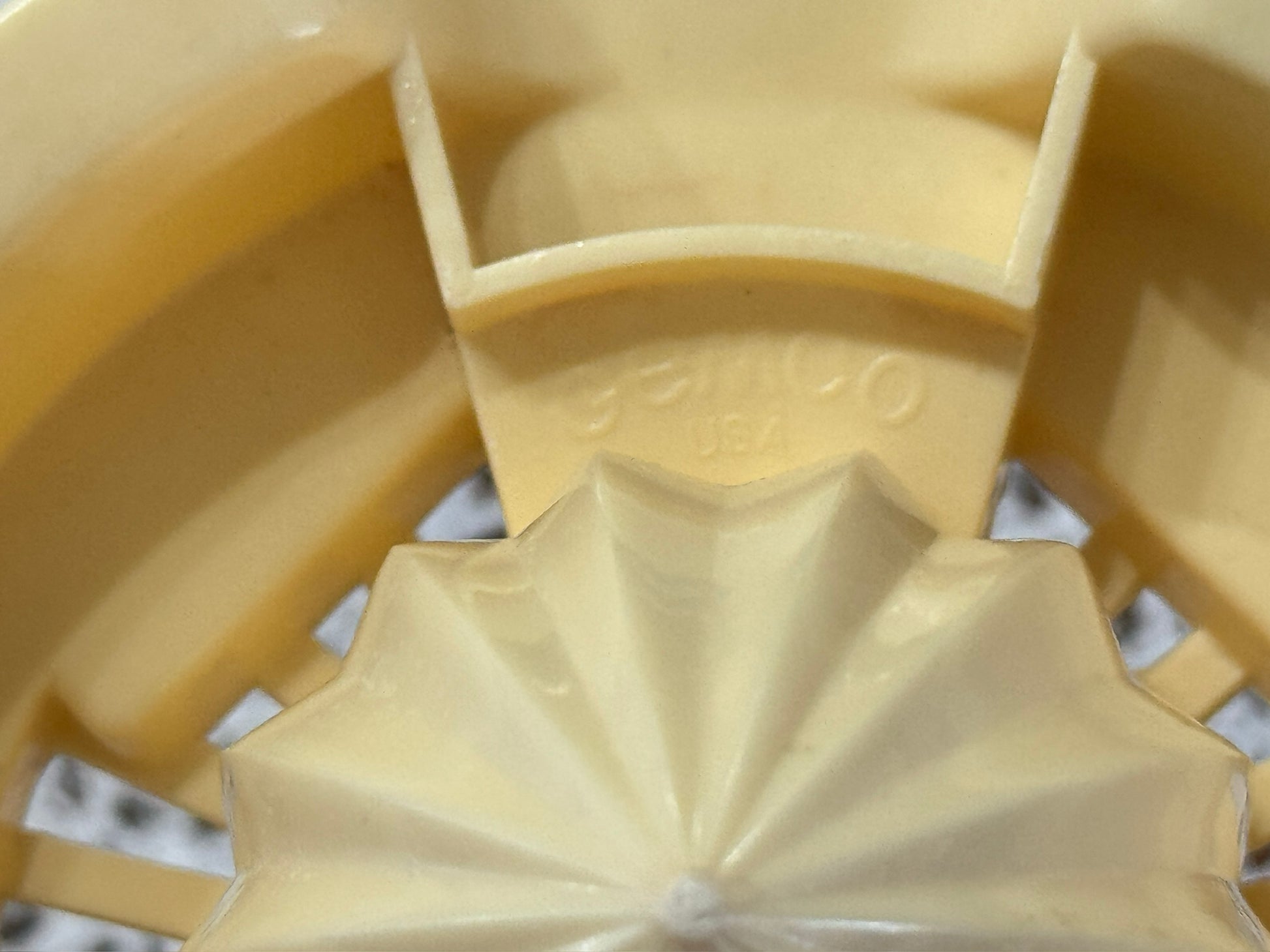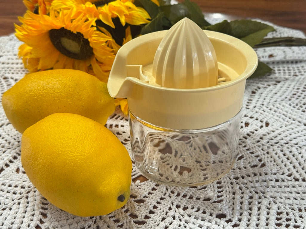 This is a lovely vintage marked GEMCO USA" Manual Juicer featuring a clear glass base with a cream coloured plastic screw on top. A lovely addition to your kitchen and cooking space.