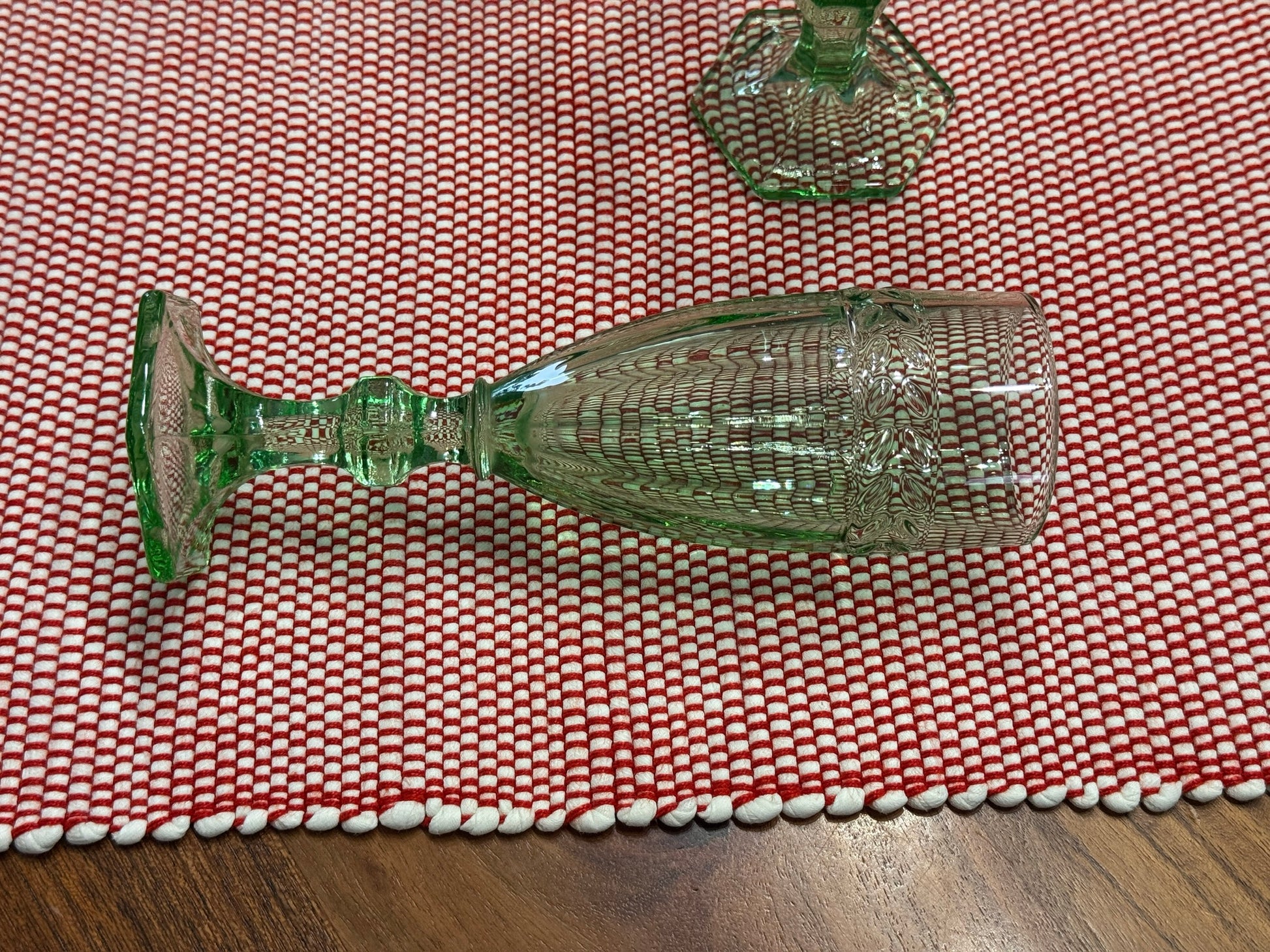 This is a lovely set of 2 unmarked Green Glass Champagne Glasses. A cute set to add to your collection and or serving ware adding a pop of colour and charm.