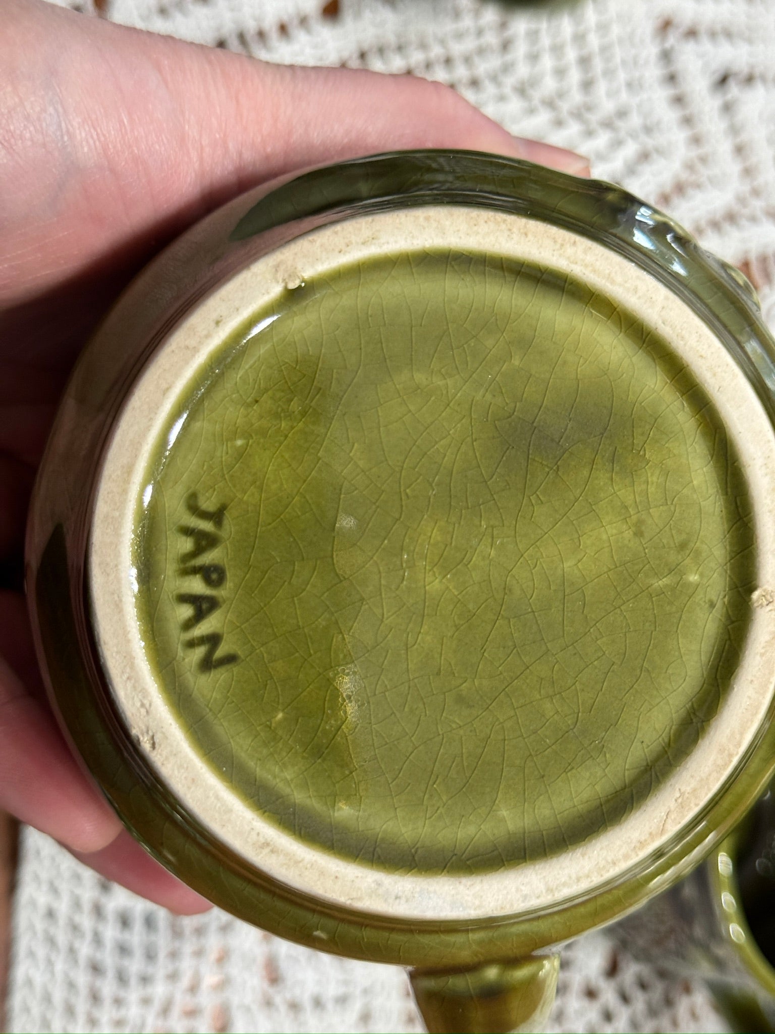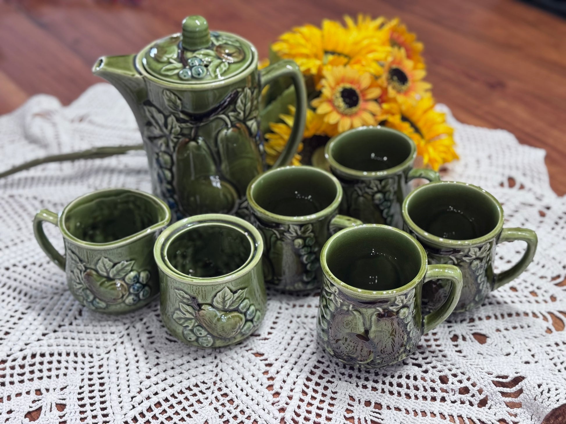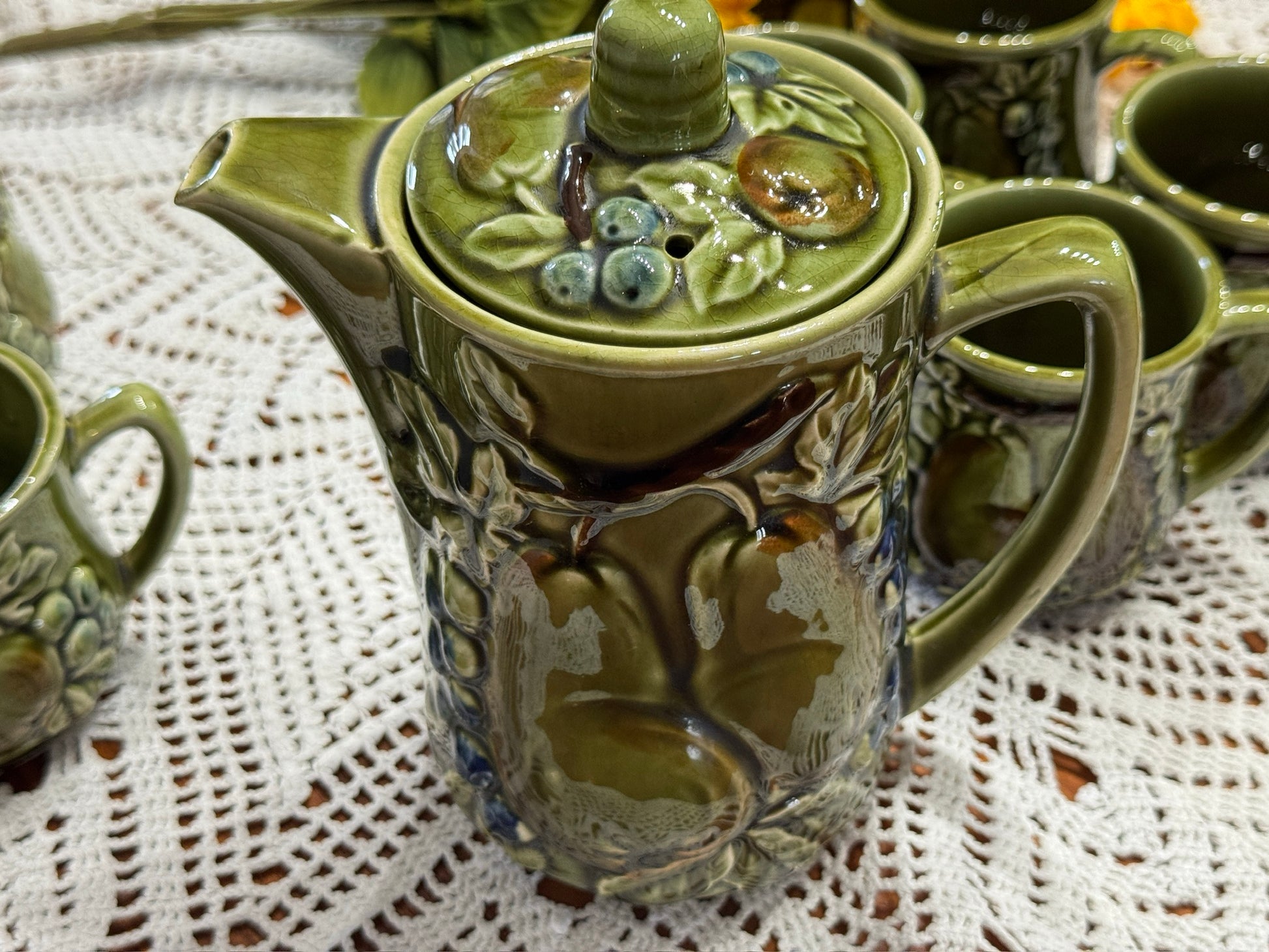 This is a lovely vintage marked "Japan" Raised Fruit Motif Tea Set in avocado green with a hint of red accent. A cute retro set to add some vintage charm to any space.