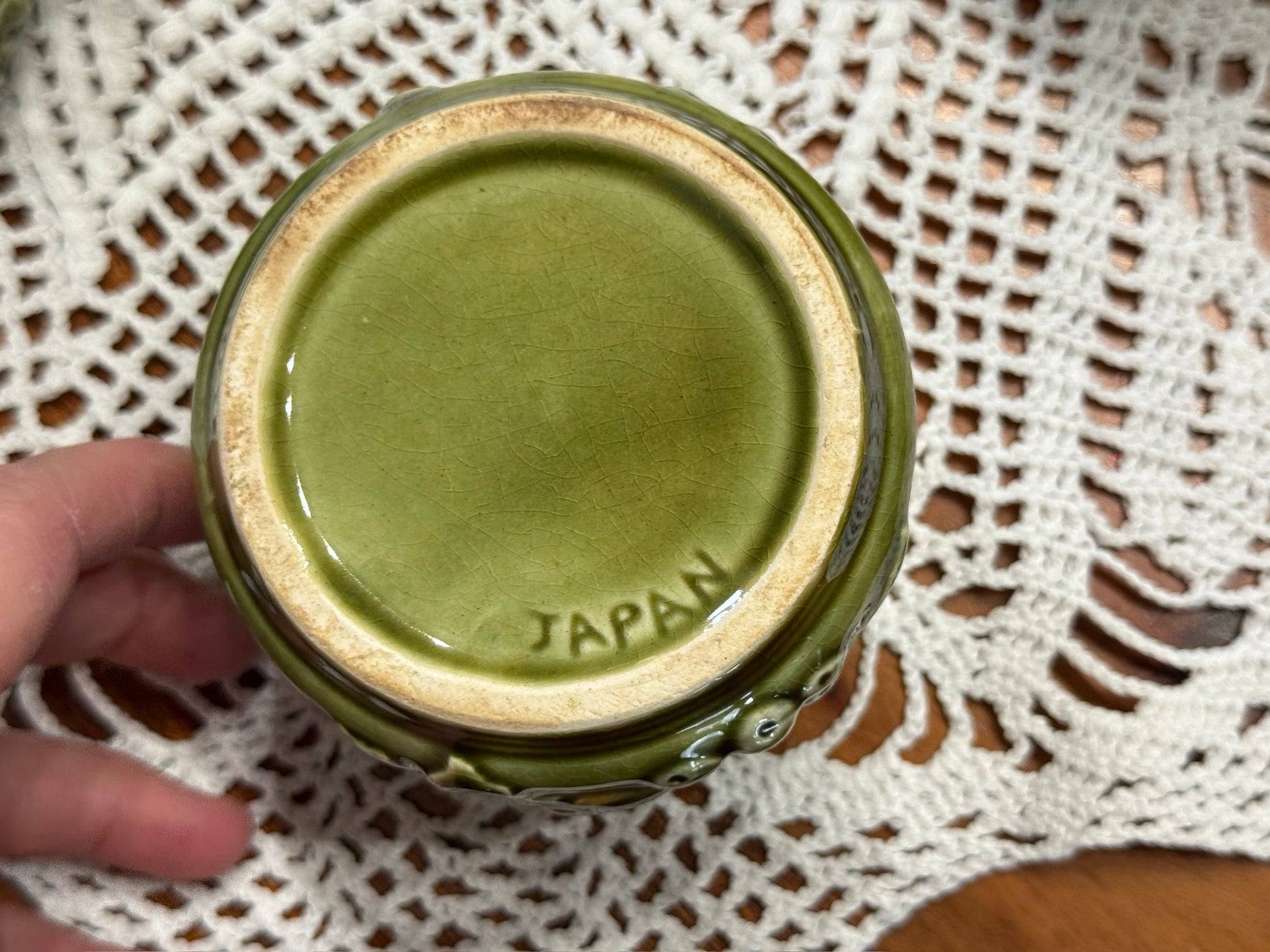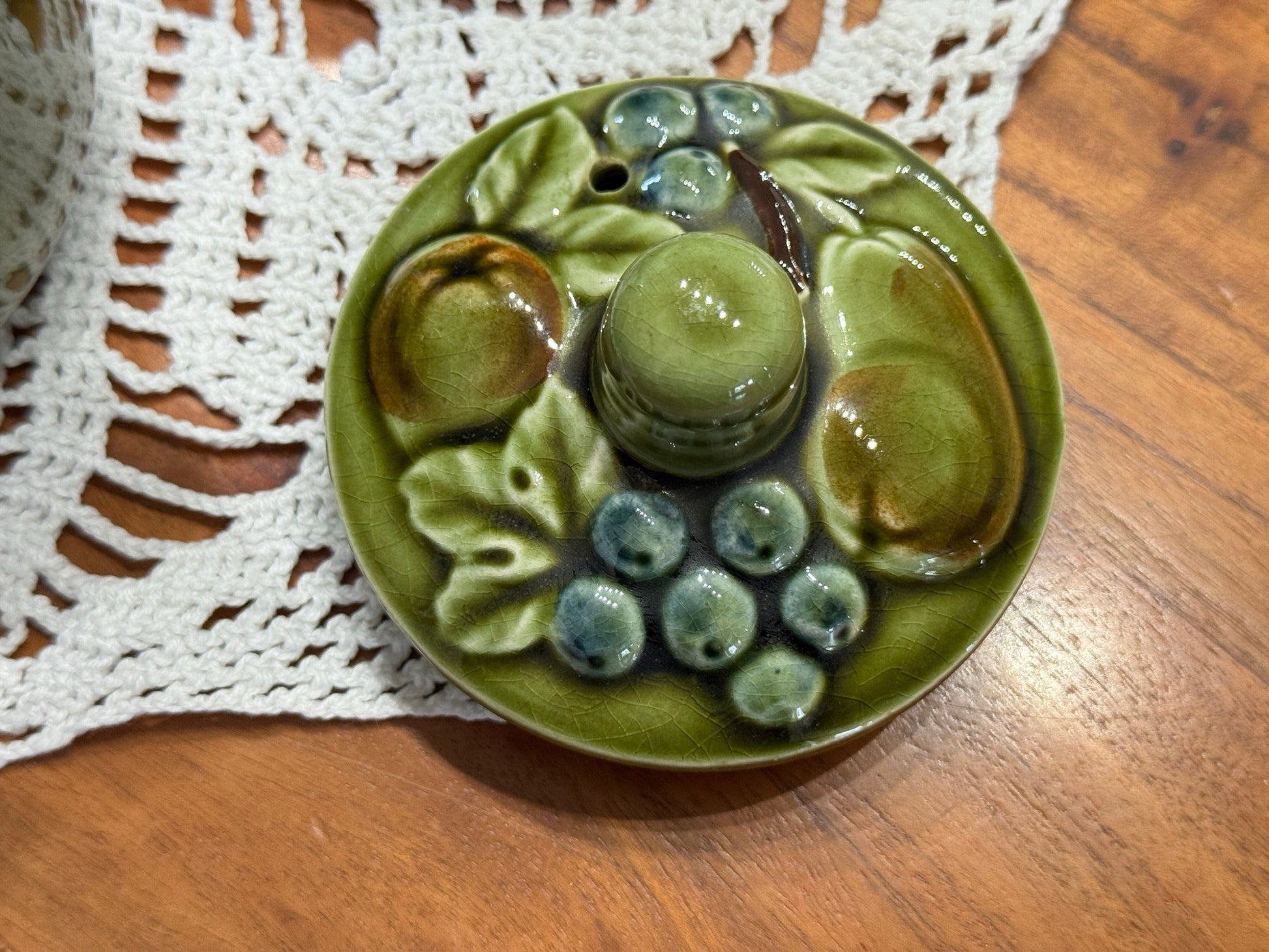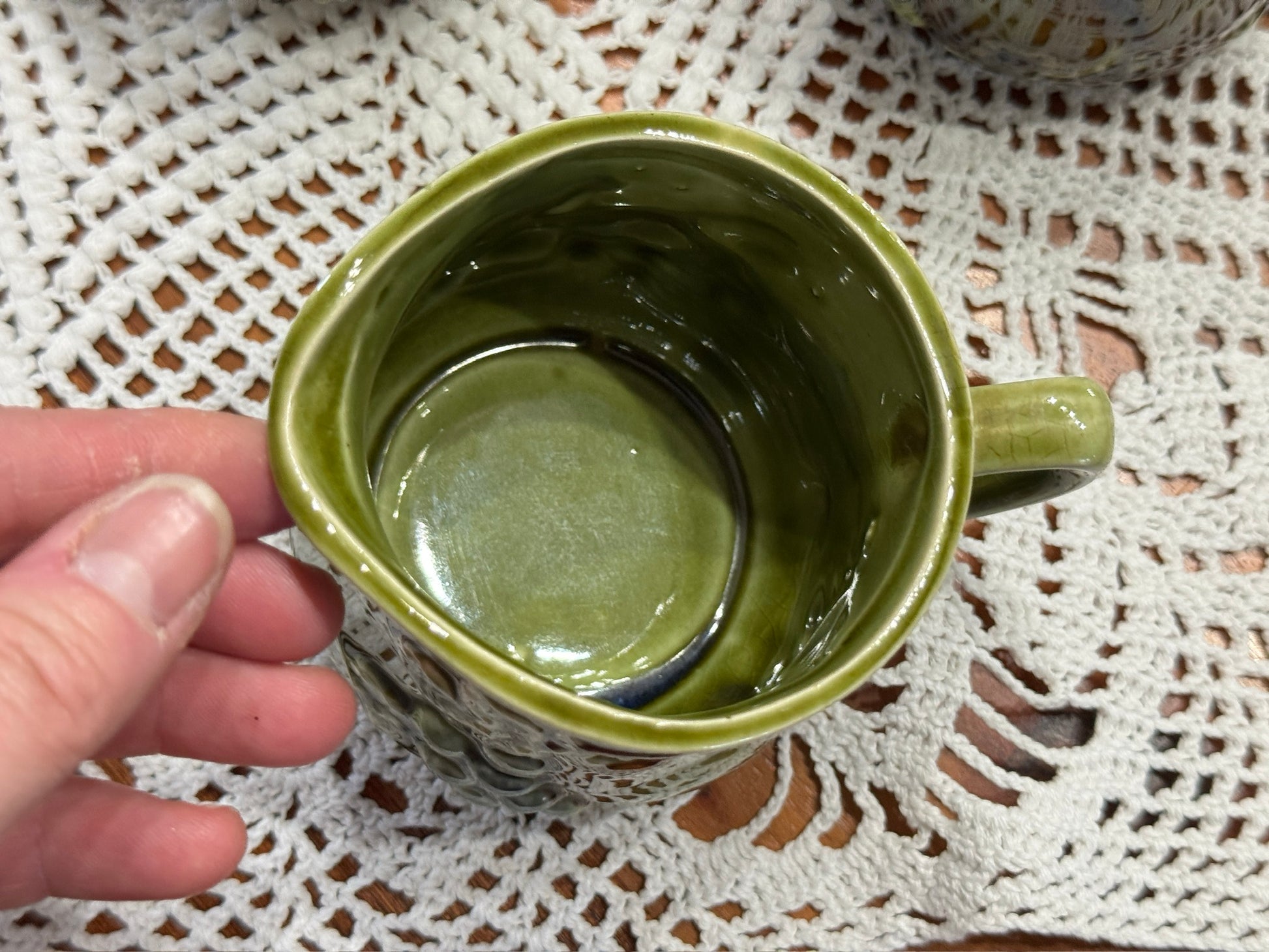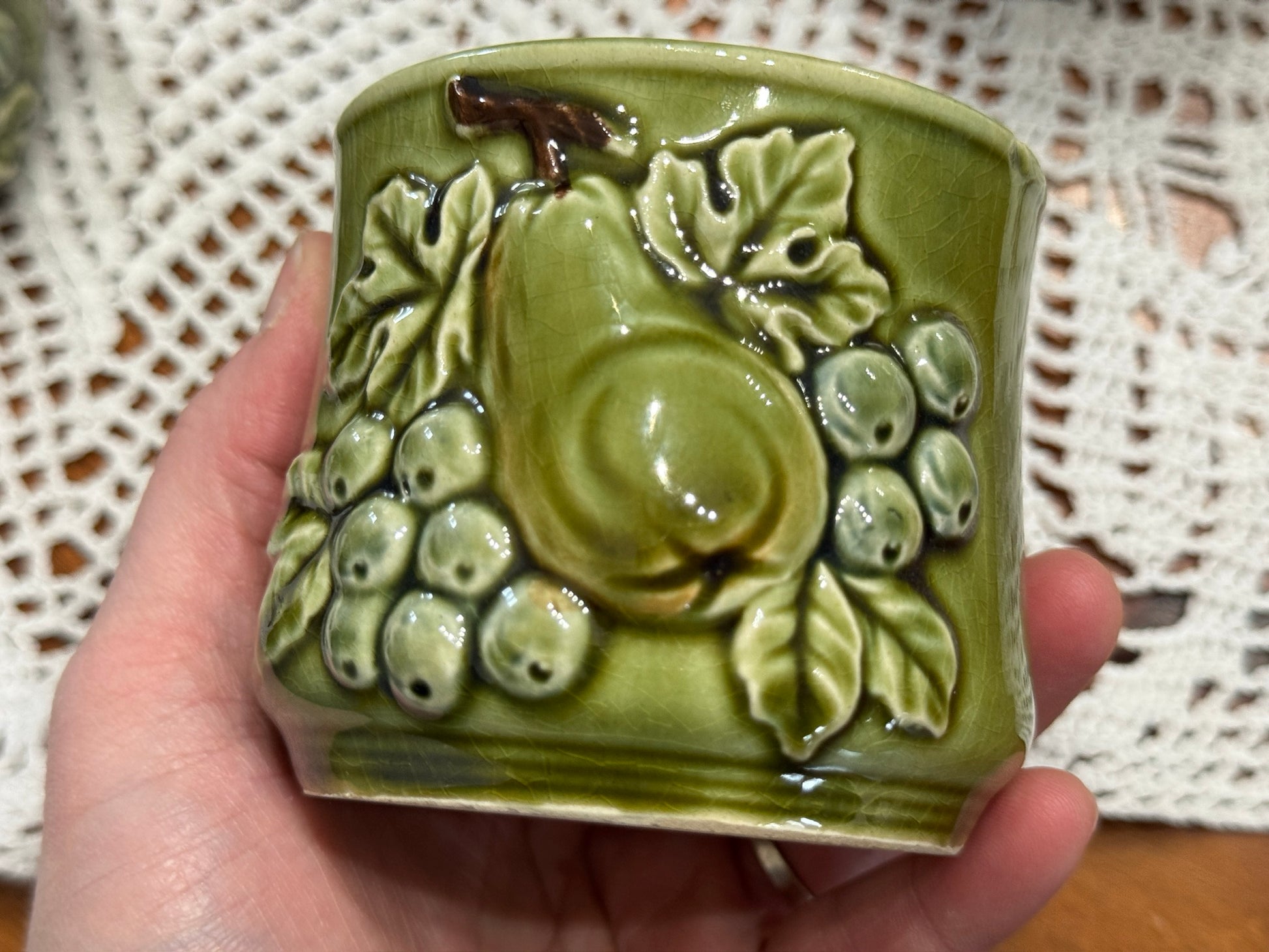 This is a lovely vintage marked "Japan" Raised Fruit Motif Tea Set in avocado green with a hint of red accent. A cute retro set to add some vintage charm to any space.