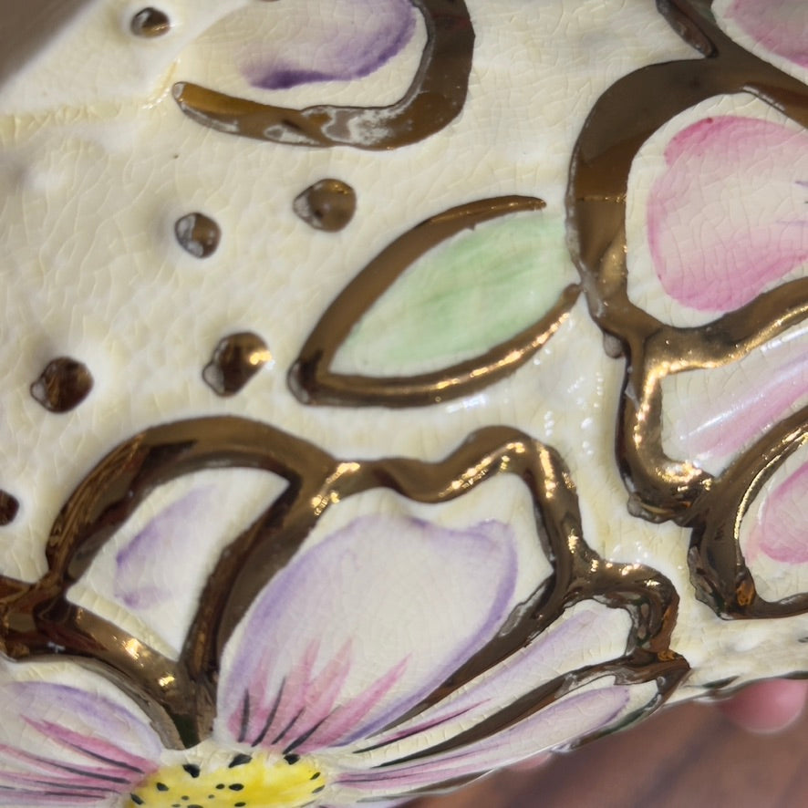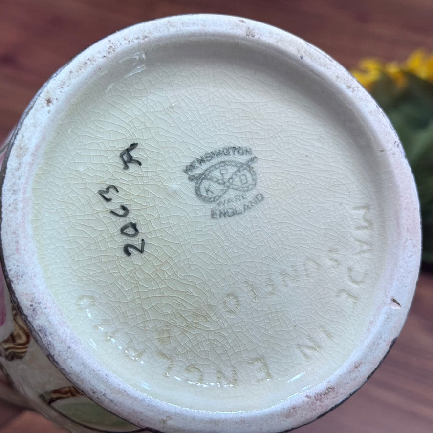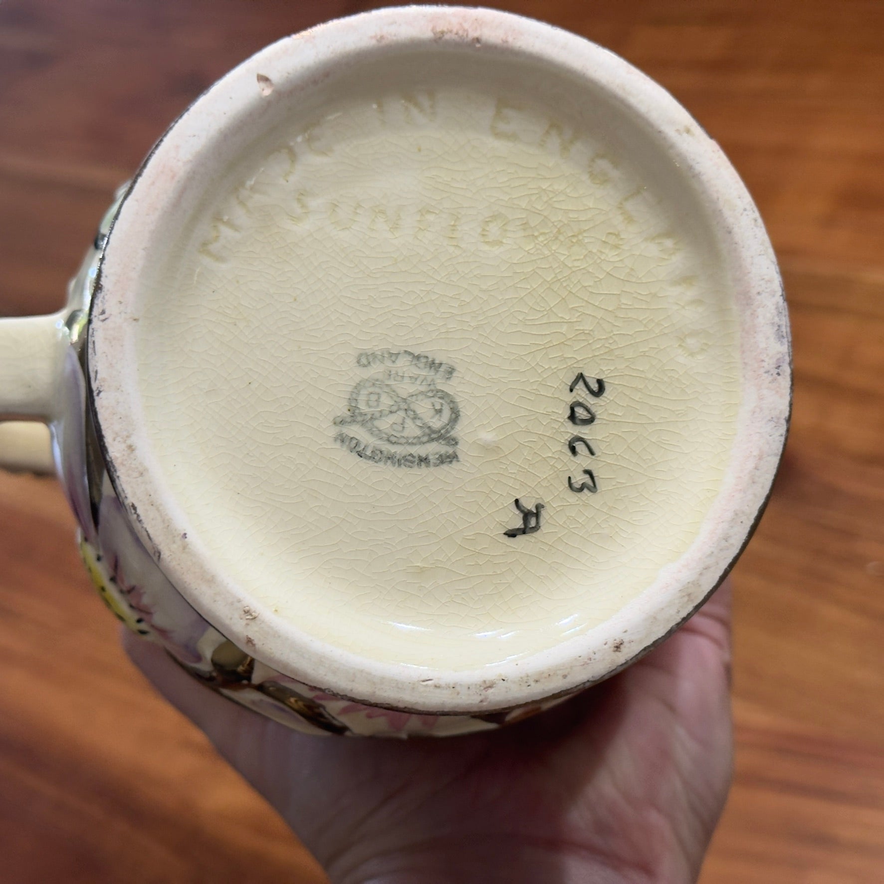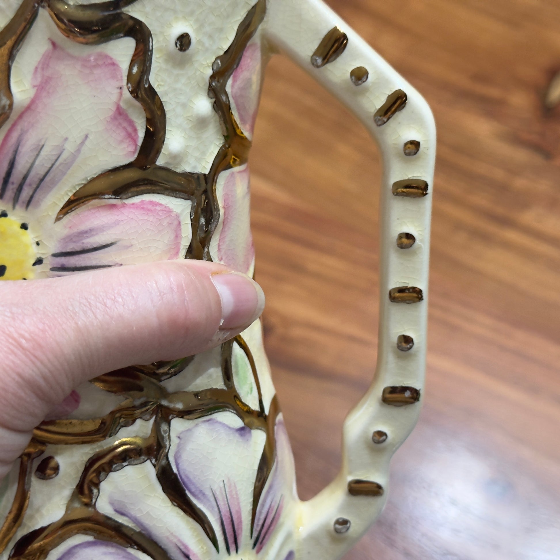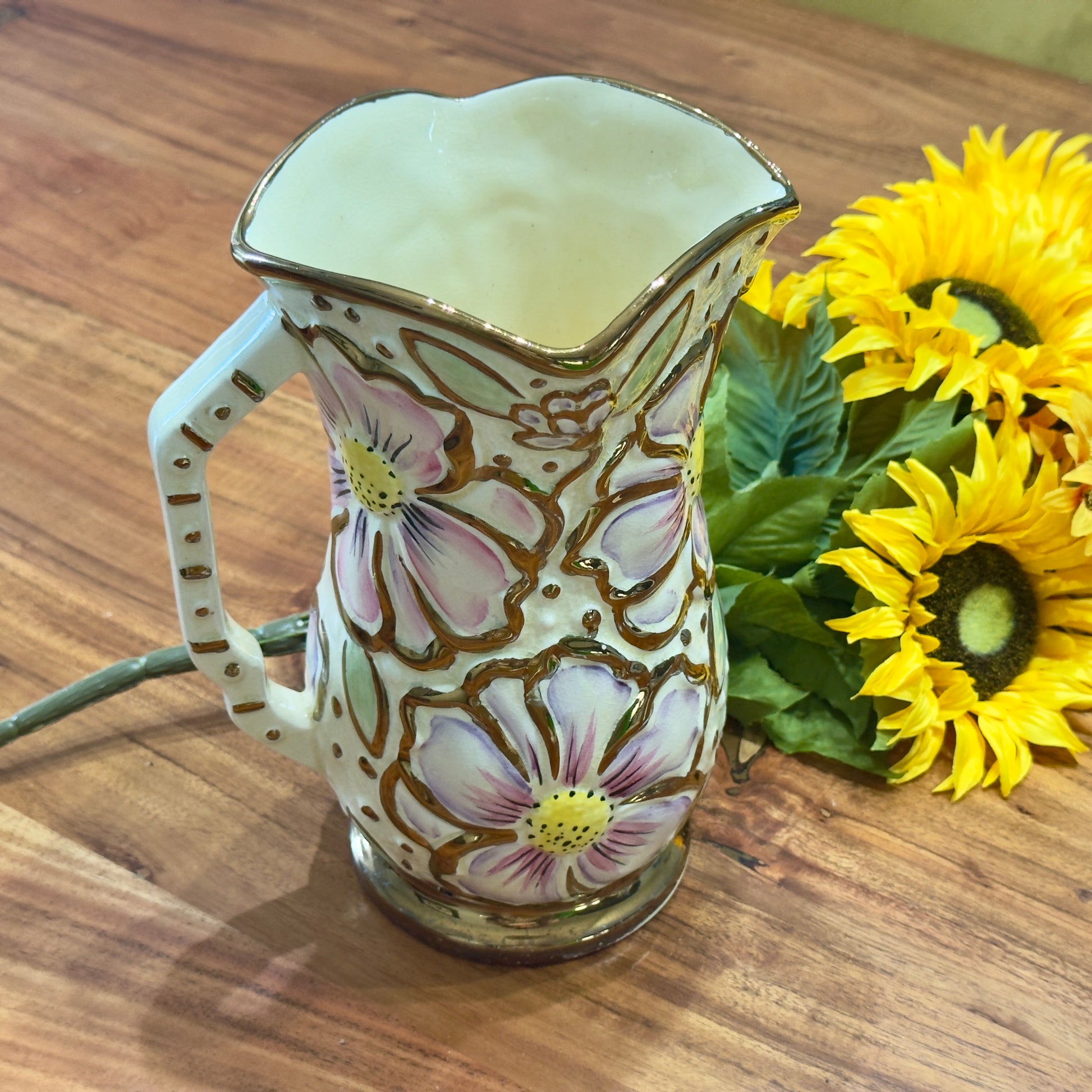 This is a vintage 1930's marked "Kensington Ware England, Made In England, Sunflower, 2063 A" Jug. This jug features a purple, pink and yellow sunflower motif with gold trim and detailing. A stunning piece that could be used as a serving jug, vase, or a stand alone decor piece.