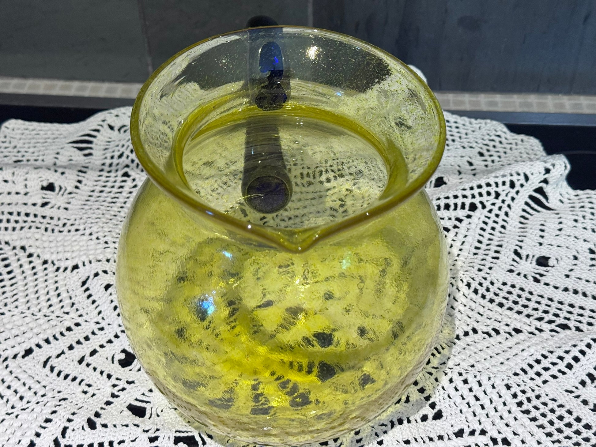 This is a lovely unmarked large Art Glass Yellow & Blue Pitcher. A stunning piece to serve some sangria, rum punch, water and or use as a vase or decor piece.
