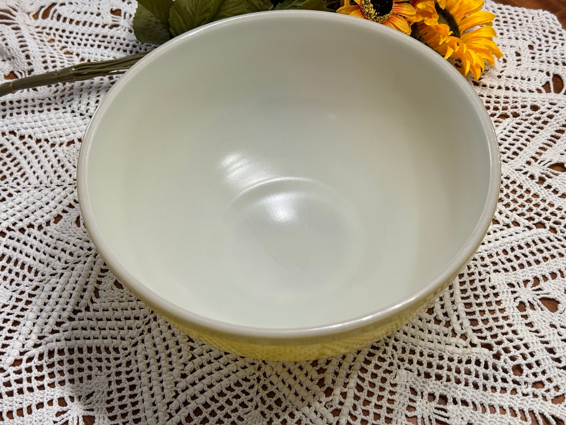 This is a lovely marked "PYREX, T.M. REG US PAT OFF" Primary Yellow Mixing Bowl. This was one of the first of the Pyrex opal ware introduced in 1940s without any standard model numbers. These dishes were sure made to last - with hand washing being the key.