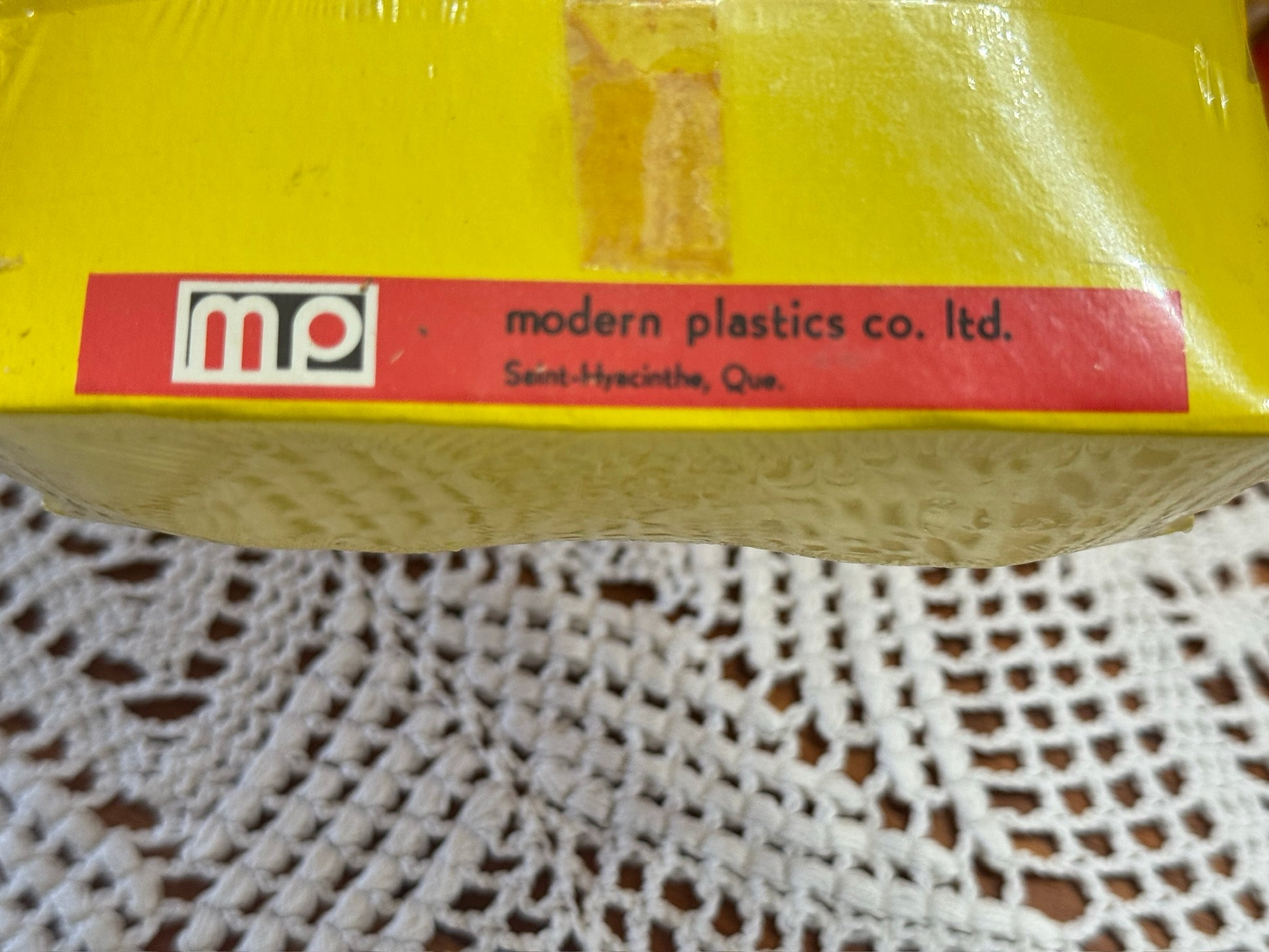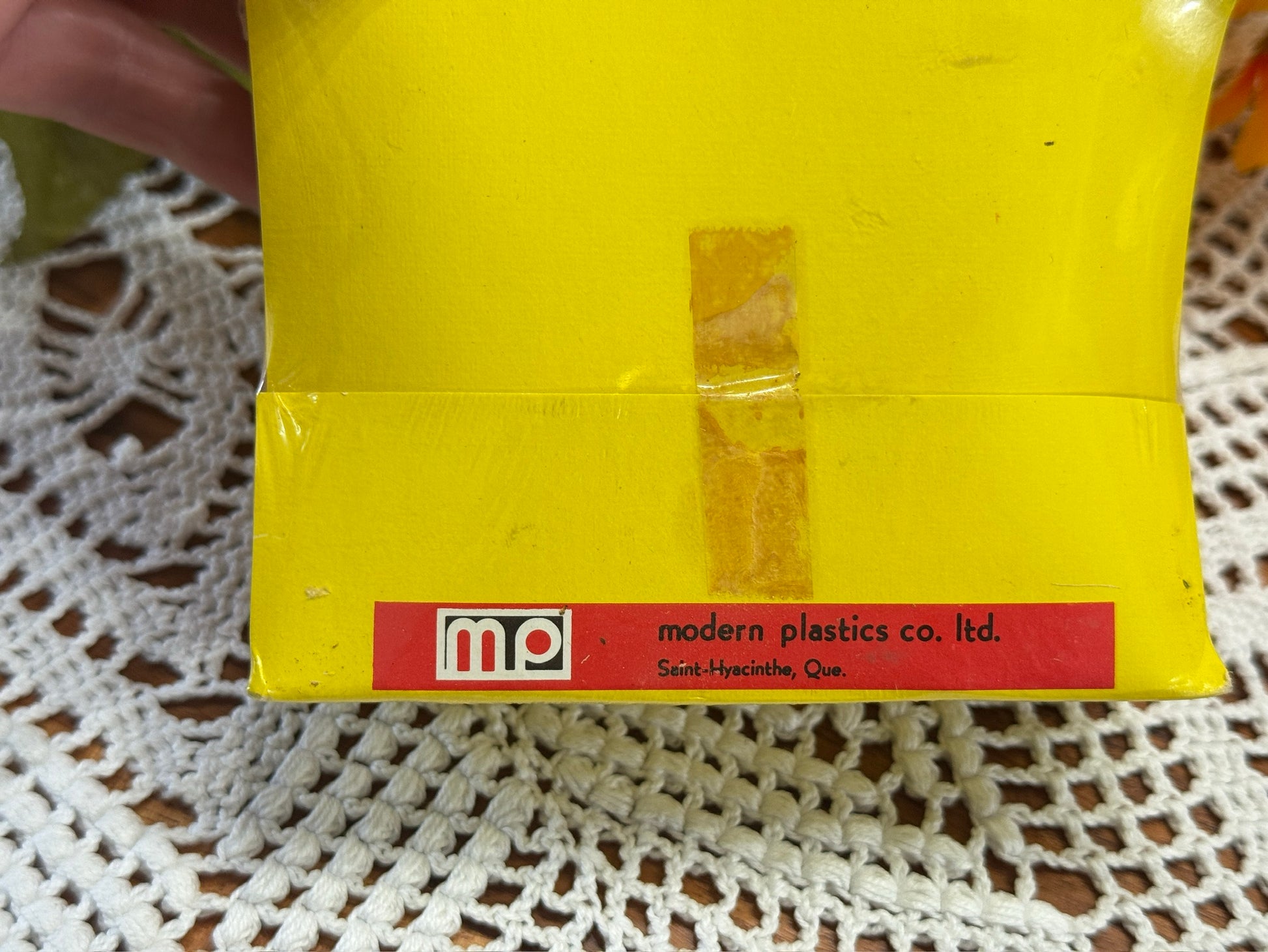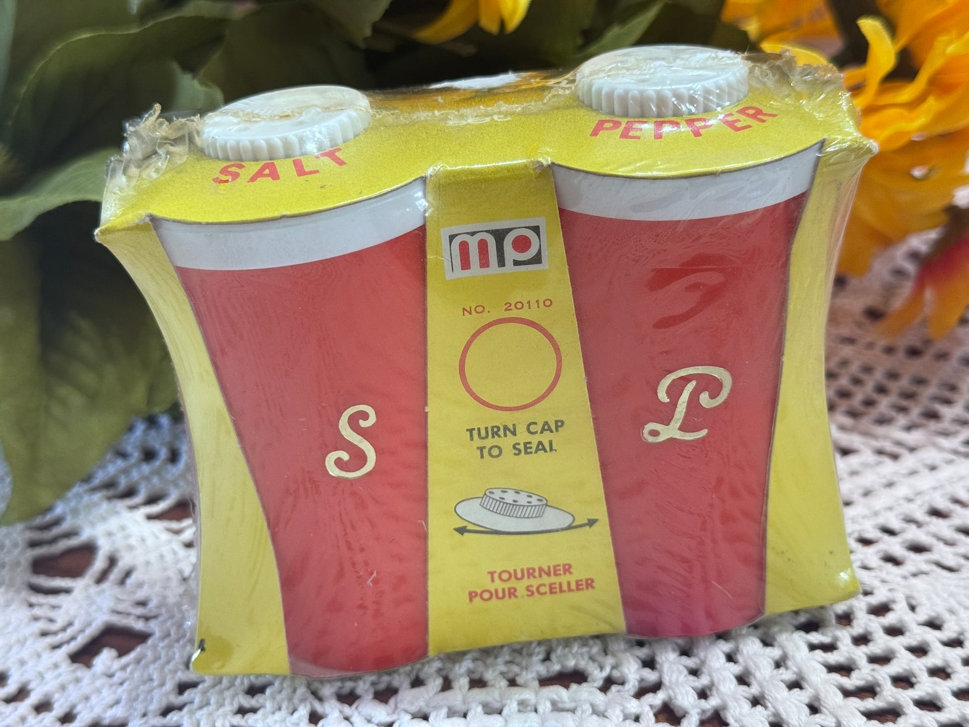 This is a lovely packaged set of marked "MP (Modern Plastics) NO. 20110, Saint-Hyacinthe, Que." Orange with White Tops Salt & Pepper Shakers. A fun retro addition to add to your collection and or kitchen ware.
