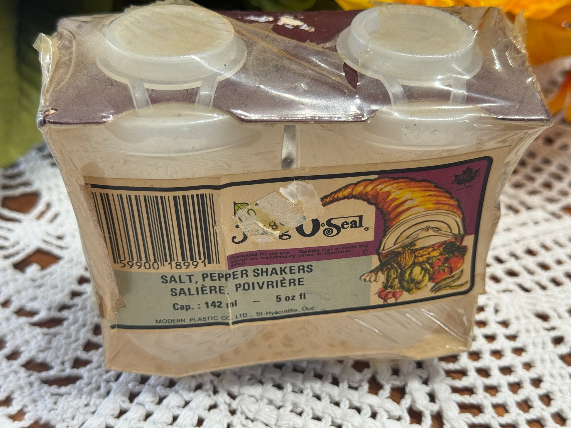 This is a lovely rare vintage set of marked "Fag O Seal, Salt, Pepper Shakers Cap 142 ml Modern Plastic CC LTD, St. Hyacinthe, Que. These are an unused made with clear plastic and gold lettering giving the retro appeal similar to that of vintage tupperware salt & pepper shakers.