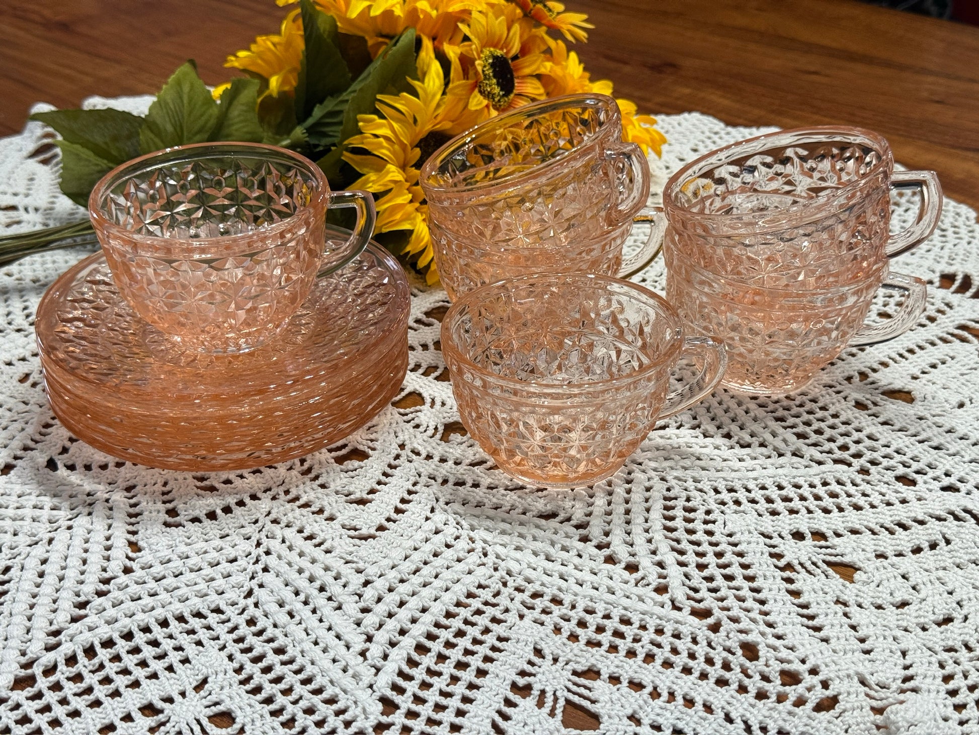 This is a lovely set of 6 vintage 1940/50s Teacup and Saucer set of Jeannette Depression Glass in the 'Holiday Buttons and Bows' pattern. A beautiful addition to your collection and or table/serving ware.