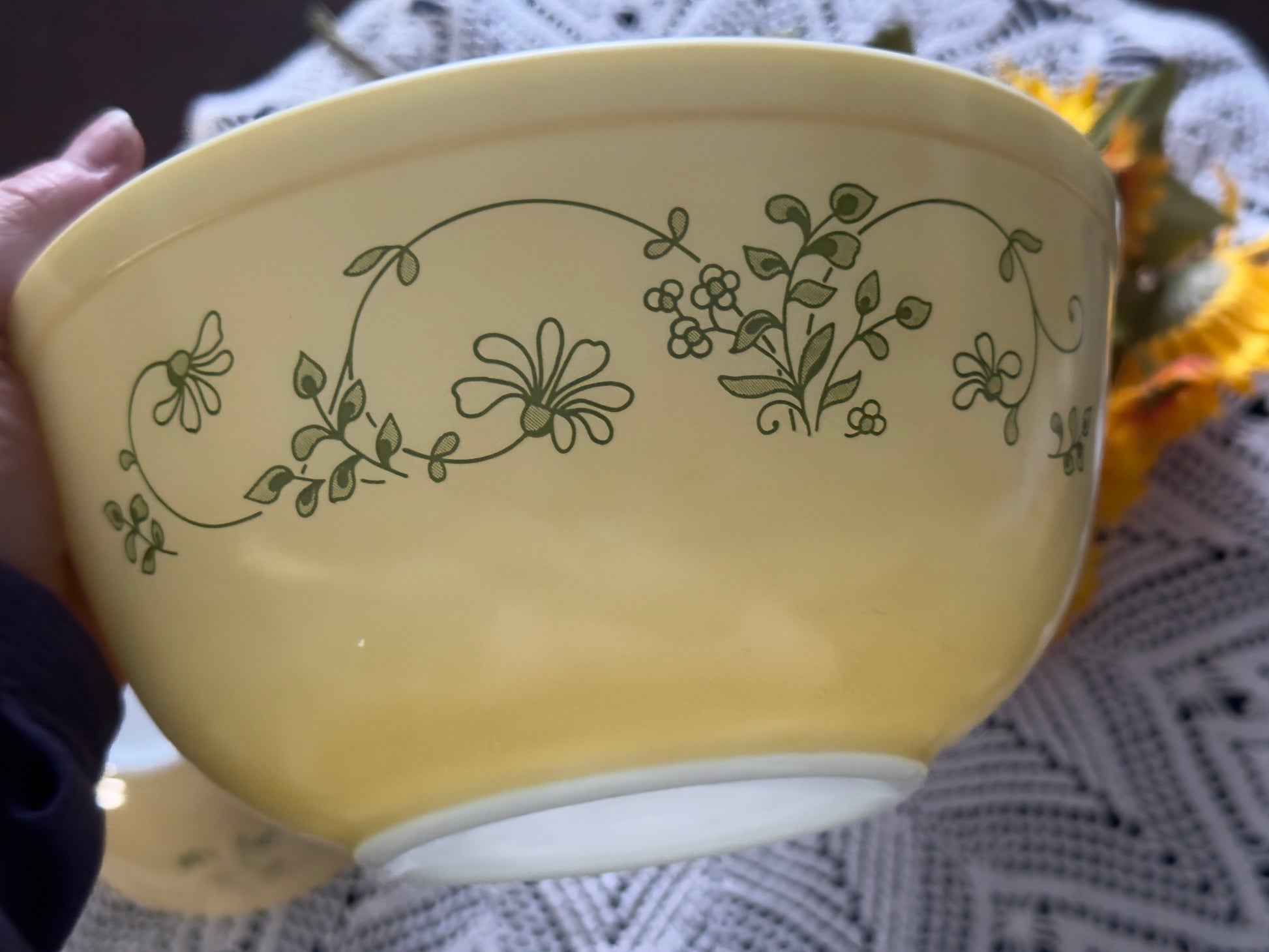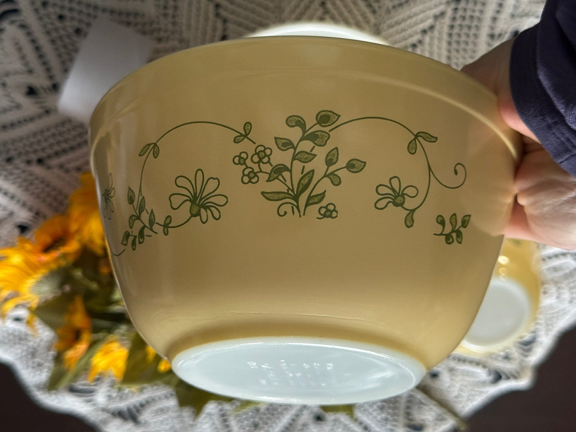 This is a lovely set of 3 vintage (1981-1986) marked "PYREX 401, 402, 403... CORNING N.Y. USA" Mixing Bowls in the Shenandoah pattern. A beautiful set to add some vintage charm and colour to your space and or kitchen/serving ware.