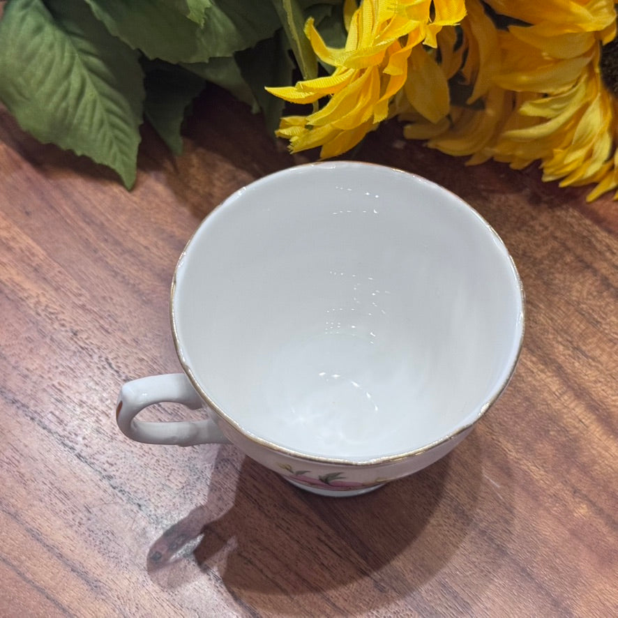 This is a lovely vintage marked "Royal Osborne, Fine Bone China, Made In England, PATT 8202" Teacup & Saucer Set. This set features pink and yellow floral with green foliage on white bone china with gold trim. A cute piece to add some charm to your collection and or serving ware.