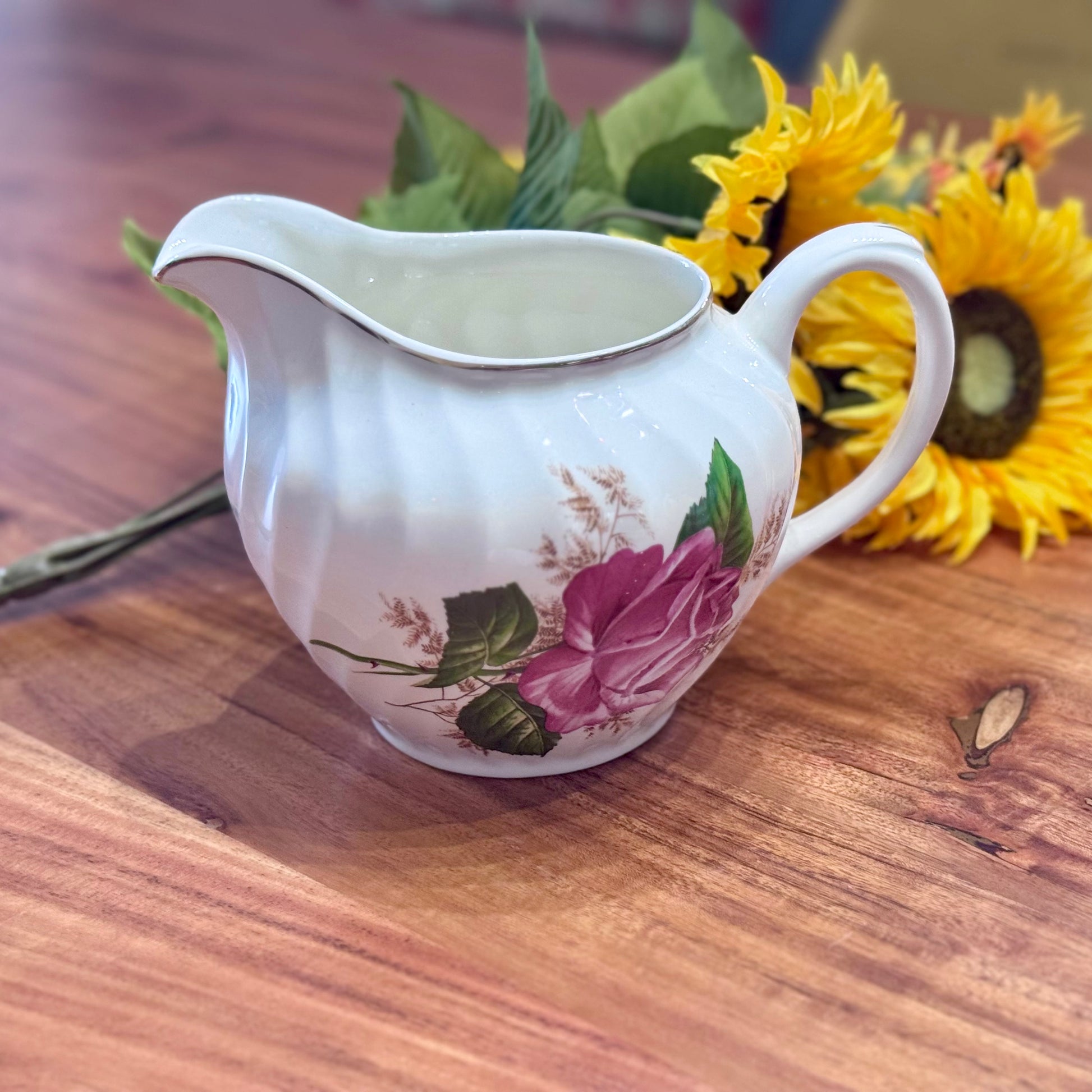 This charming vintage Large Creamer is marked "Royal Wessex Ironstone Made In England By Swinnertons." It showcases a delicate rose floral pattern on a swirled white background, accented with elegant gold trim. An excellent classic addition for collectors or for enhancing your serving set.