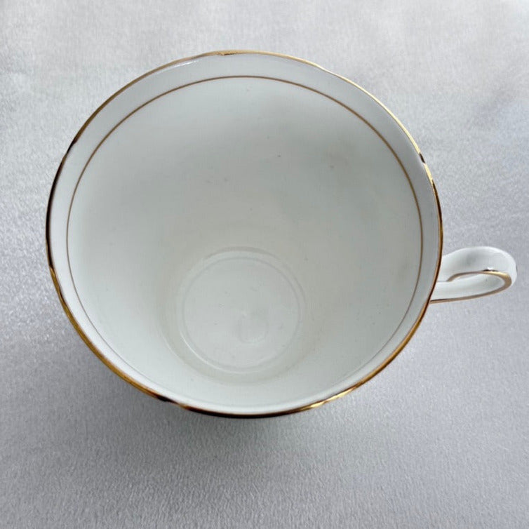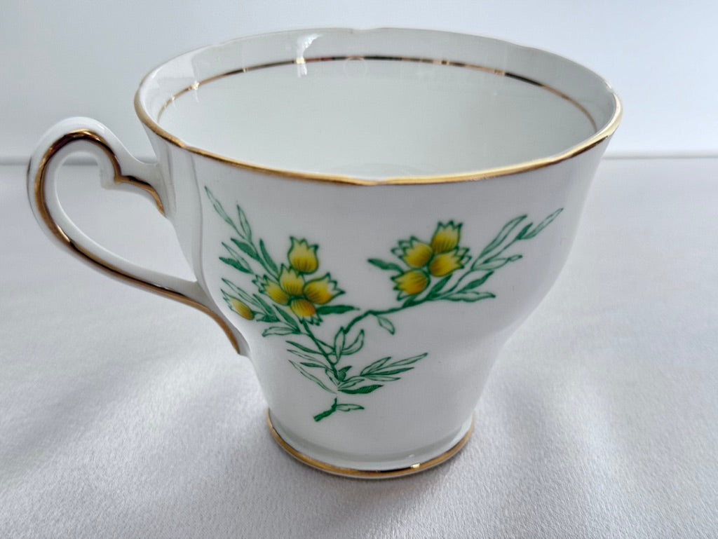 This Teacup & Saucer, made by Salisbury Fine Bone China, features a stunning Vintage "Bell Heather" pattern with a white base and accents of yellow and green flowers. The design is enhanced with gold trim along the top, base, handle, and inner cup, and also on the outer rim of the saucer. The bottom of each piece is marked with the manufacturer's information and hand-drawn numbering. In overall good condition, this set is a must-have for any collector.