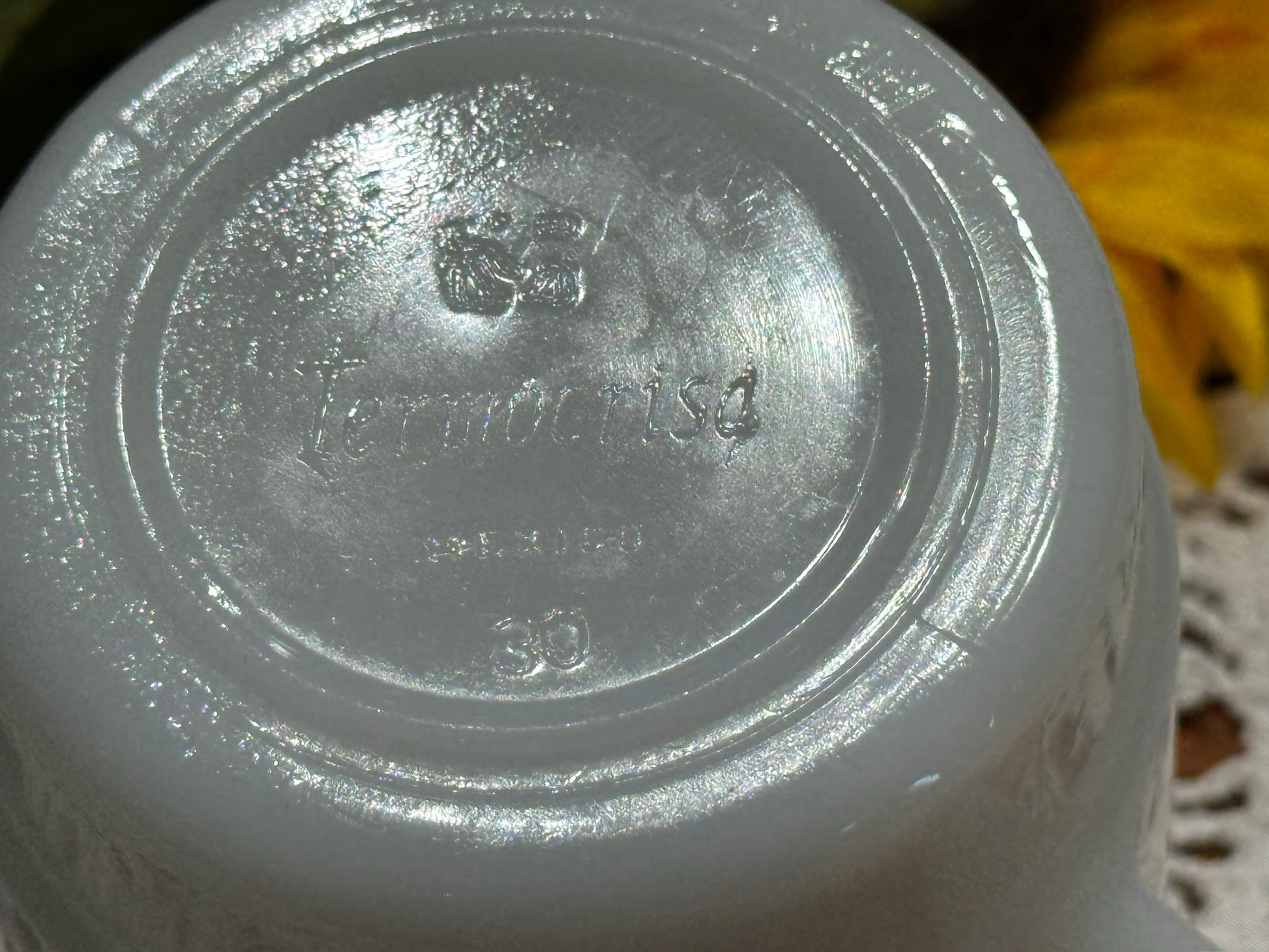 This is a cute marked "Termocrisa Mexico" Milk Glass Mug with a cute orange and green floral design. A nice addition to your kitchen and or serving ware.