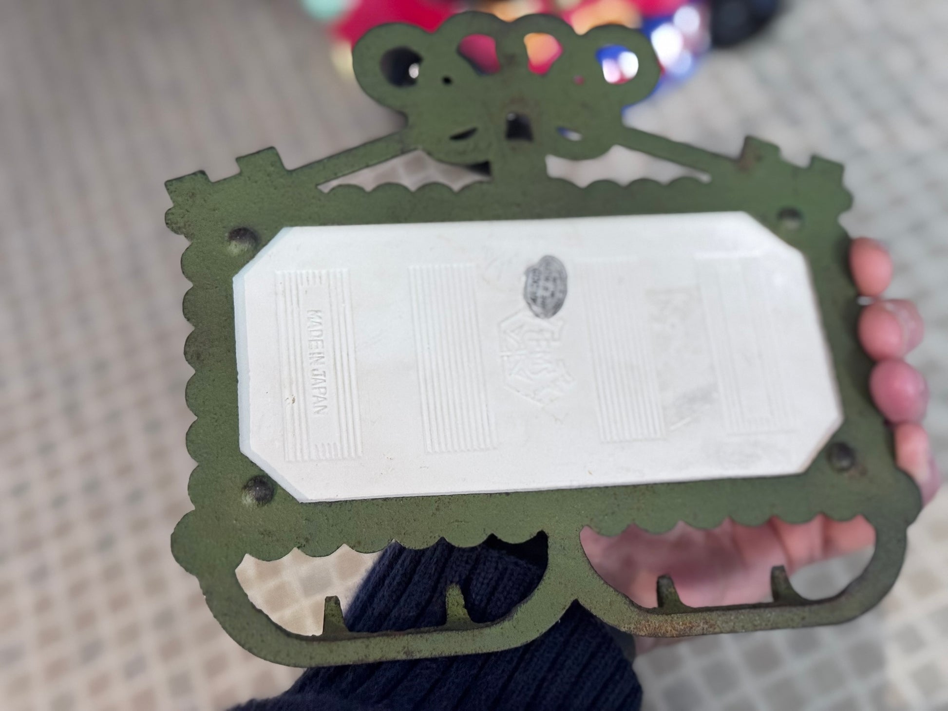 This is a lovely vintage marked "FM Made In Japan" Cast Iron & Ceramic Tile Wall Hanger- perfect for keys, towels and utensils. A fun and stunning addition to any space.